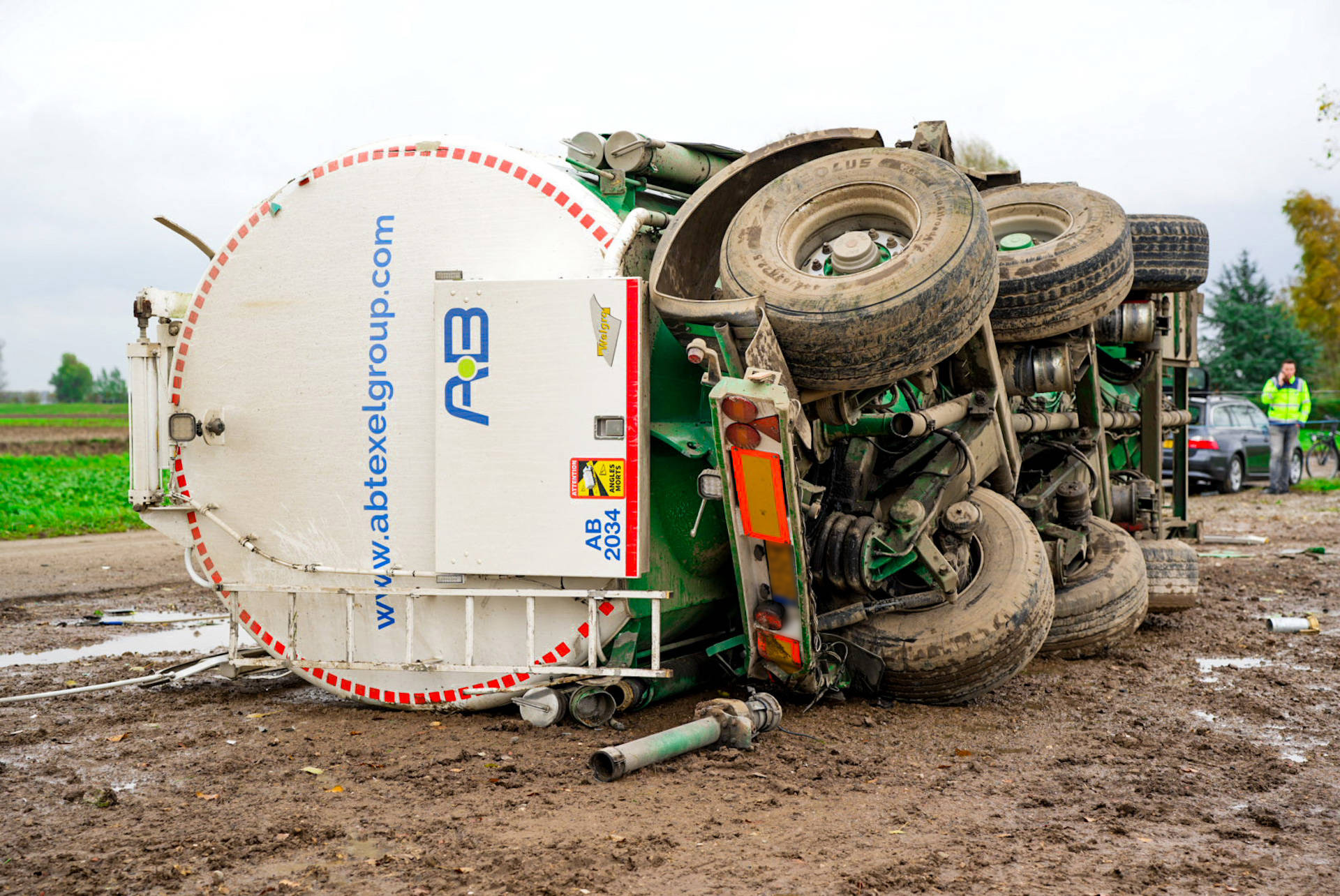 Een ander voertuig van het transportbedrijf is onderweg om de lading tarwe over te nemen. De berging van zowel het voertuig als het beschadigde monument zal naar verwachting nog geruime tijd duren.