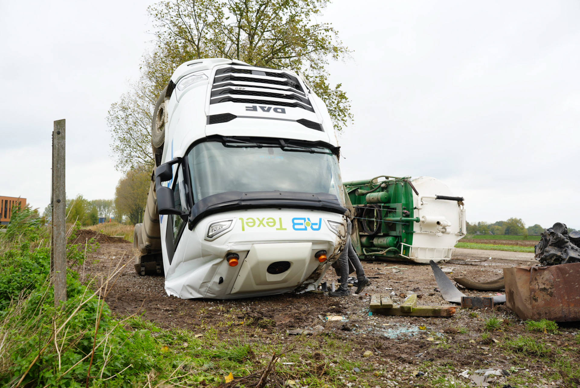 Een ander voertuig van het transportbedrijf is onderweg om de lading tarwe over te nemen. De berging van zowel het voertuig als het beschadigde monument zal naar verwachting nog geruime tijd duren.