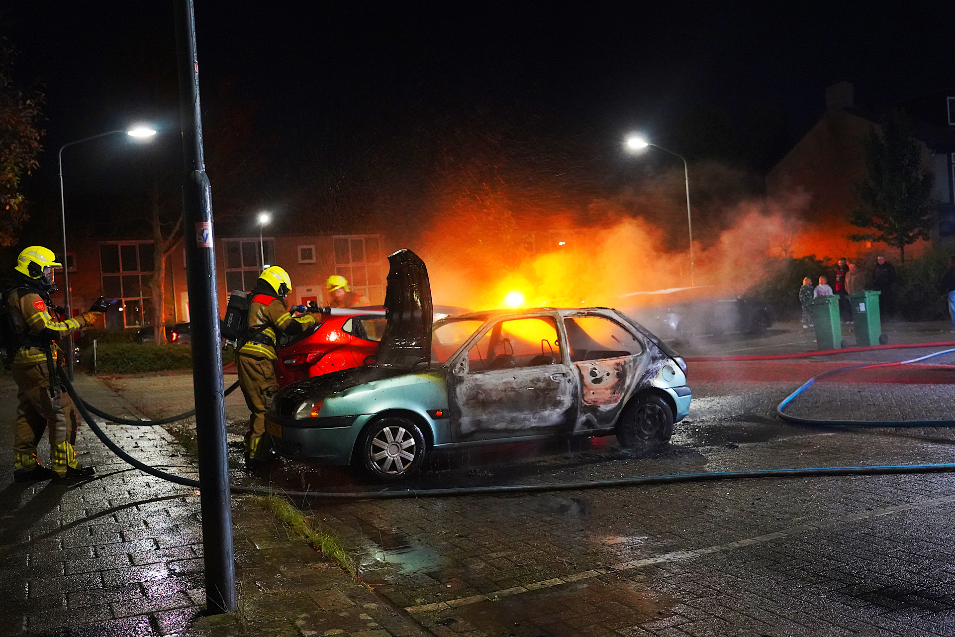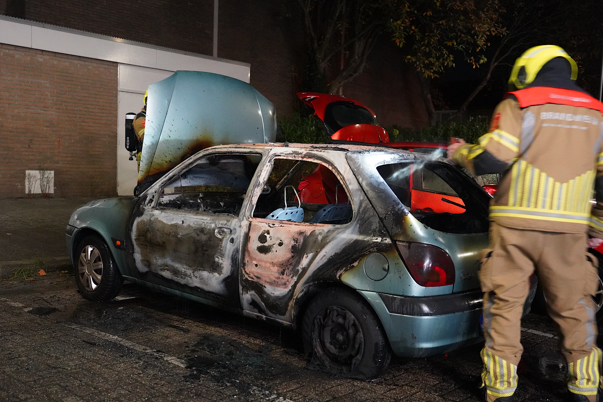 Een naastgelegen geparkeerde auto liep schade op door de hitte. De oorzaak van de brand wordt onderzocht door de politie.