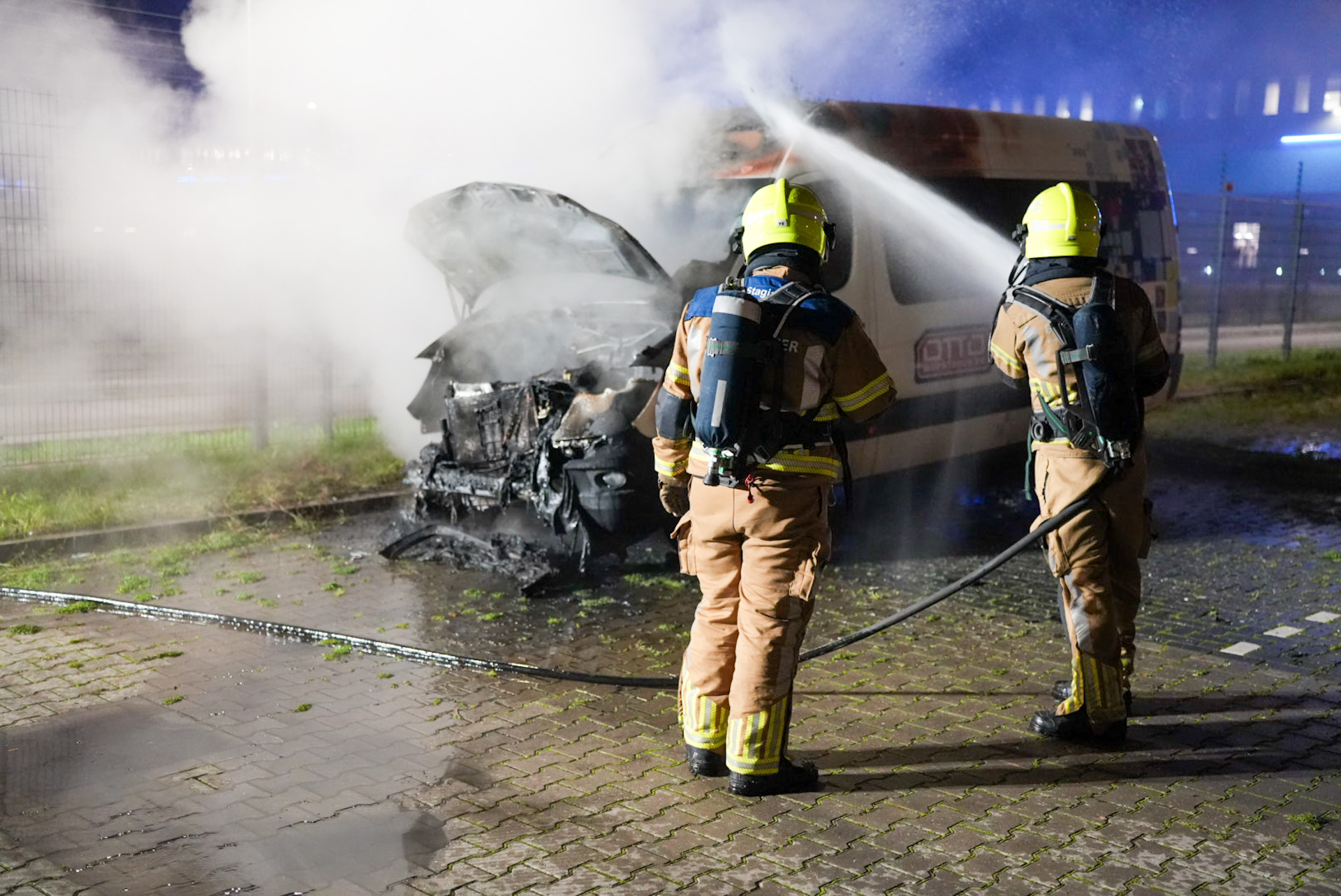 De brandweer was snel ter plaatse en had het vuur snel onder controle, maar het voertuig brandde volledig uit en wordt als verloren beschouwd. Ook de politie kwam snel ter plaatse en hield op de parkeerplaats een man aan. Hij is overgebracht naar het politiebureau voor verhoor.