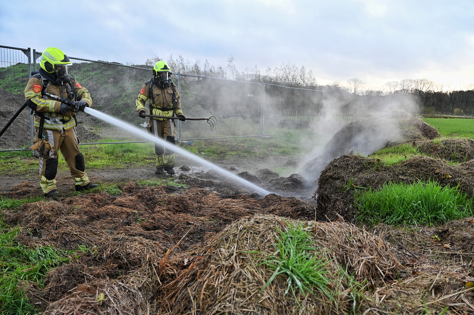 Brandweer blust smeulende berg maai-afval