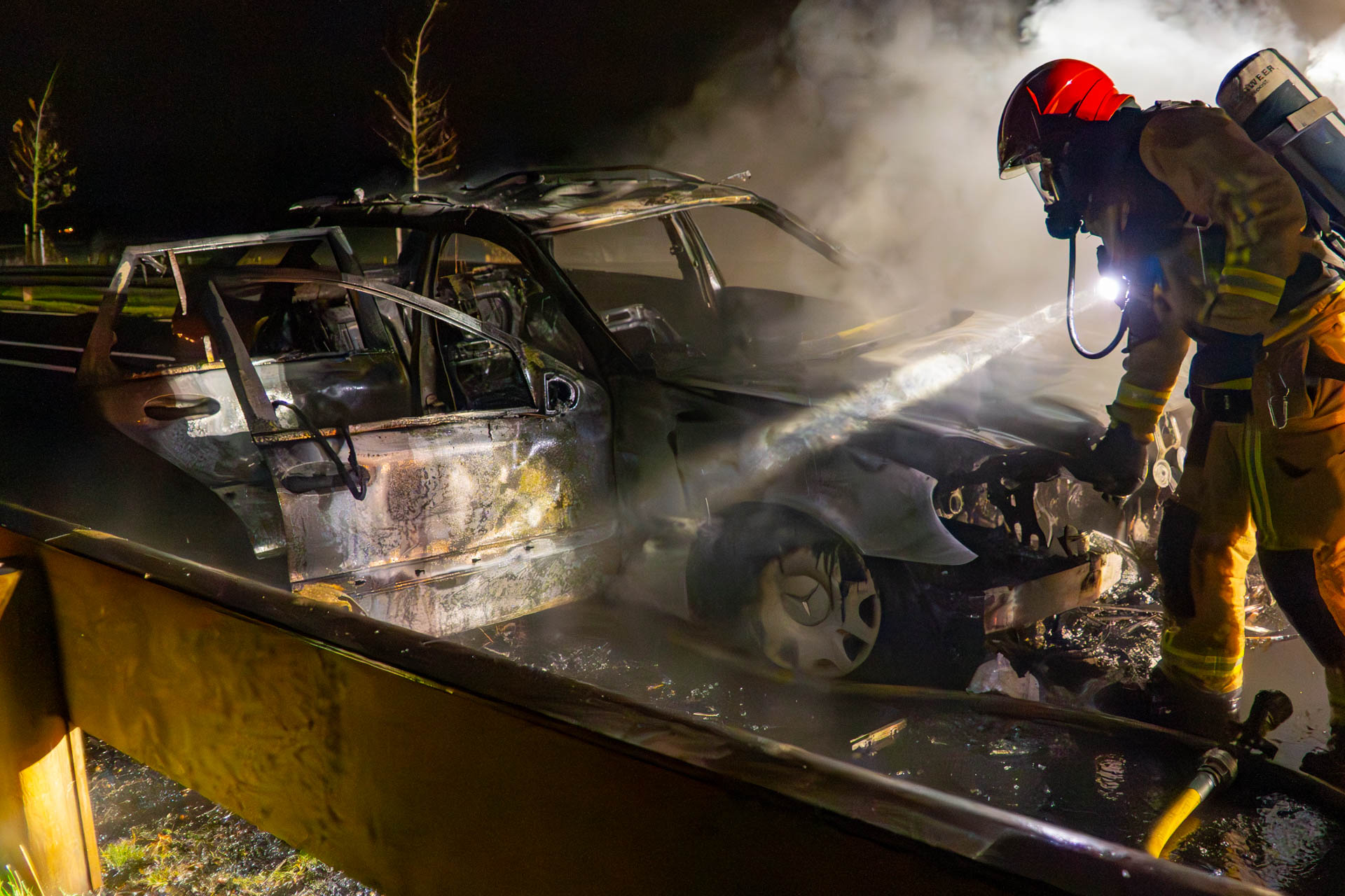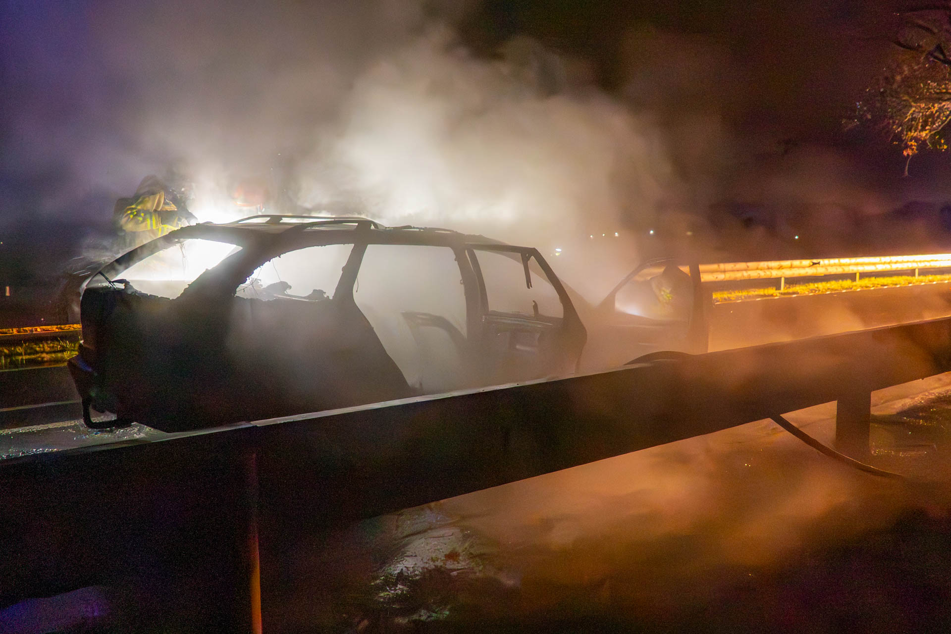 Vanwege vangrails langs de weg kon de automobilist de auto niet in de berm zetten. Hij wist het voertuig veilig te verlaten en liet het op de rijbaan staan. De brandweer heeft de brand geblust, maar de auto is volledig uitgebrand.