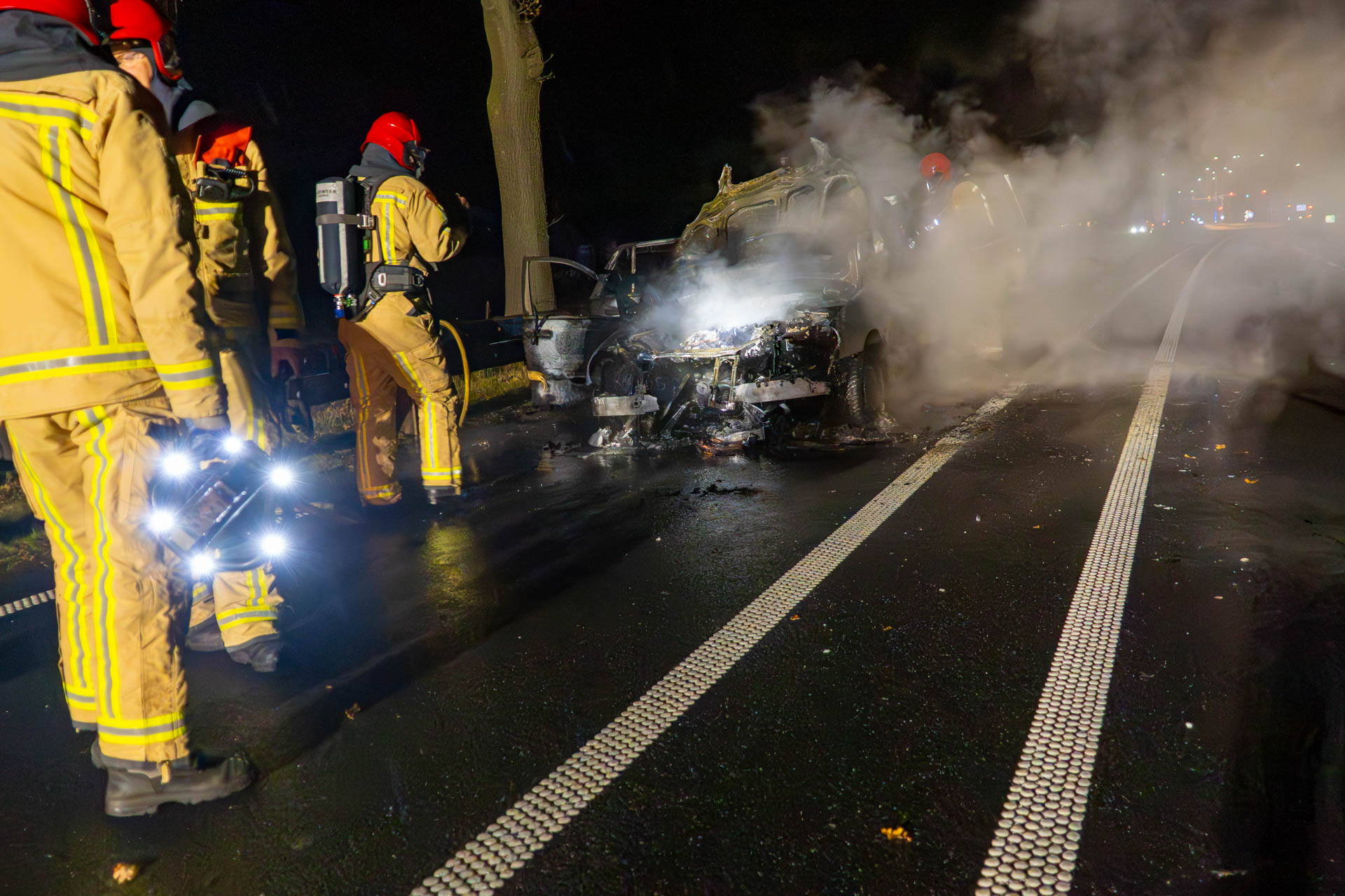 Vanwege vangrails langs de weg kon de automobilist de auto niet in de berm zetten. Hij wist het voertuig veilig te verlaten en liet het op de rijbaan staan. De brandweer heeft de brand geblust, maar de auto is volledig uitgebrand.