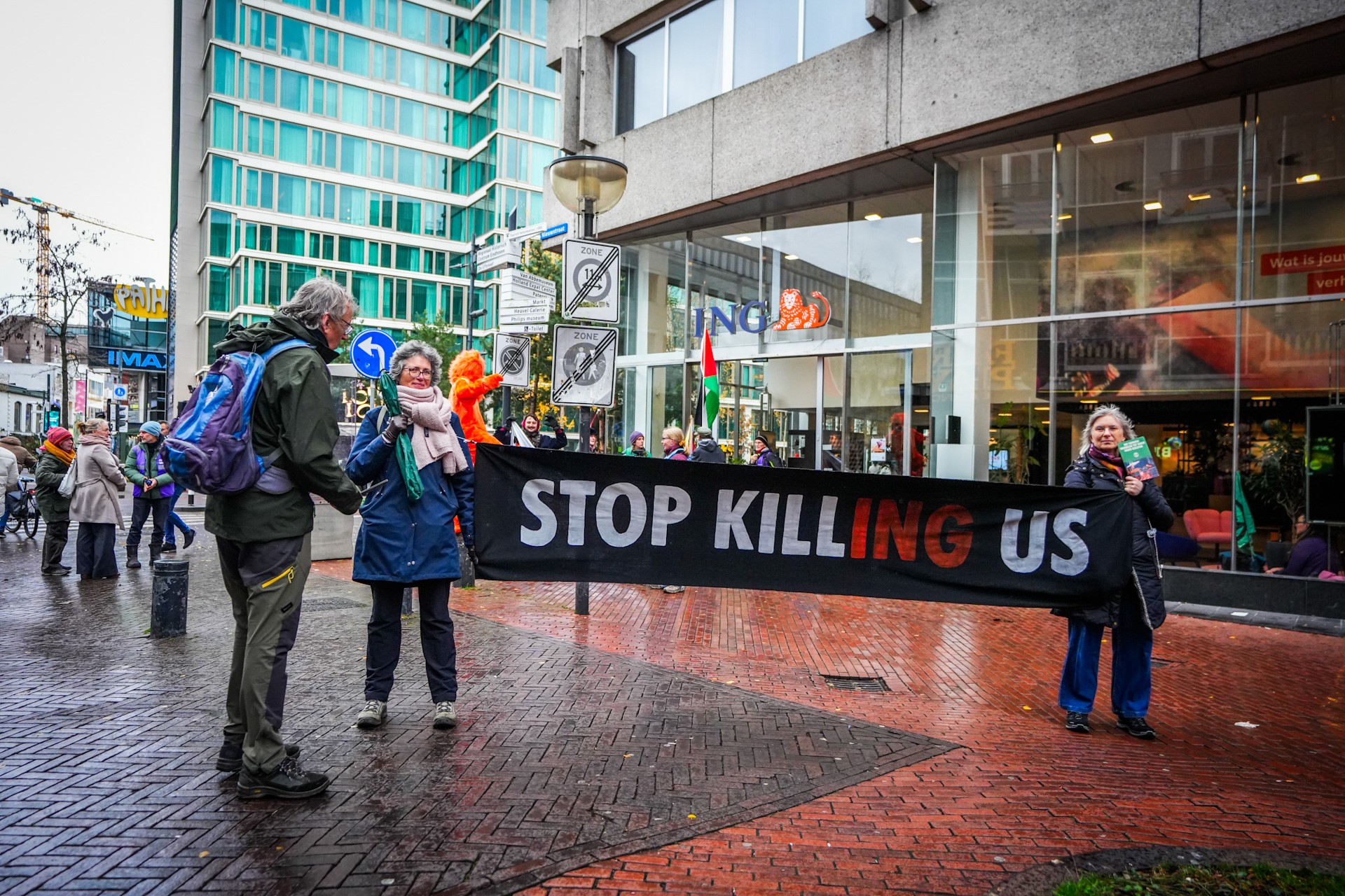EINDHOVEN – Activisten van Extinction Rebellion hebben zaterdagmiddag de ingang van de ING-bank aan de Nieuwstraat bezet. Enkele demonstranten bonden zich vast aan meubels binnen het pand, terwijl anderen buiten met spandoeken en een Palestijnse vlag actie voerden. De bank bleef toegankelijk voor klanten en personeel, meldt Brabants Dagblad.