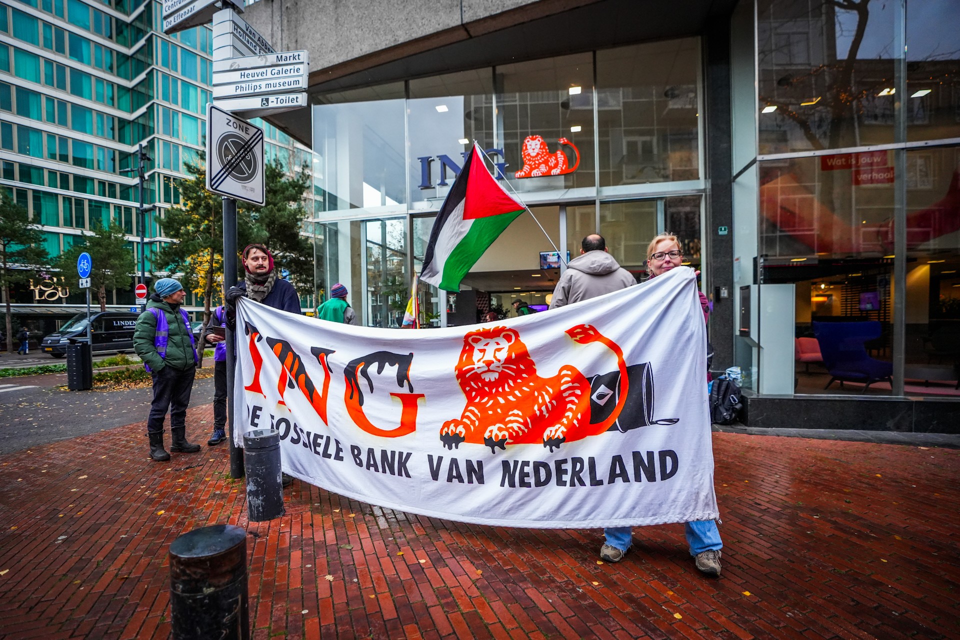 EINDHOVEN – Activisten van Extinction Rebellion hebben zaterdagmiddag de ingang van de ING-bank aan de Nieuwstraat bezet. Enkele demonstranten bonden zich vast aan meubels binnen het pand, terwijl anderen buiten met spandoeken en een Palestijnse vlag actie voerden. De bank bleef toegankelijk voor klanten en personeel, meldt Brabants Dagblad.