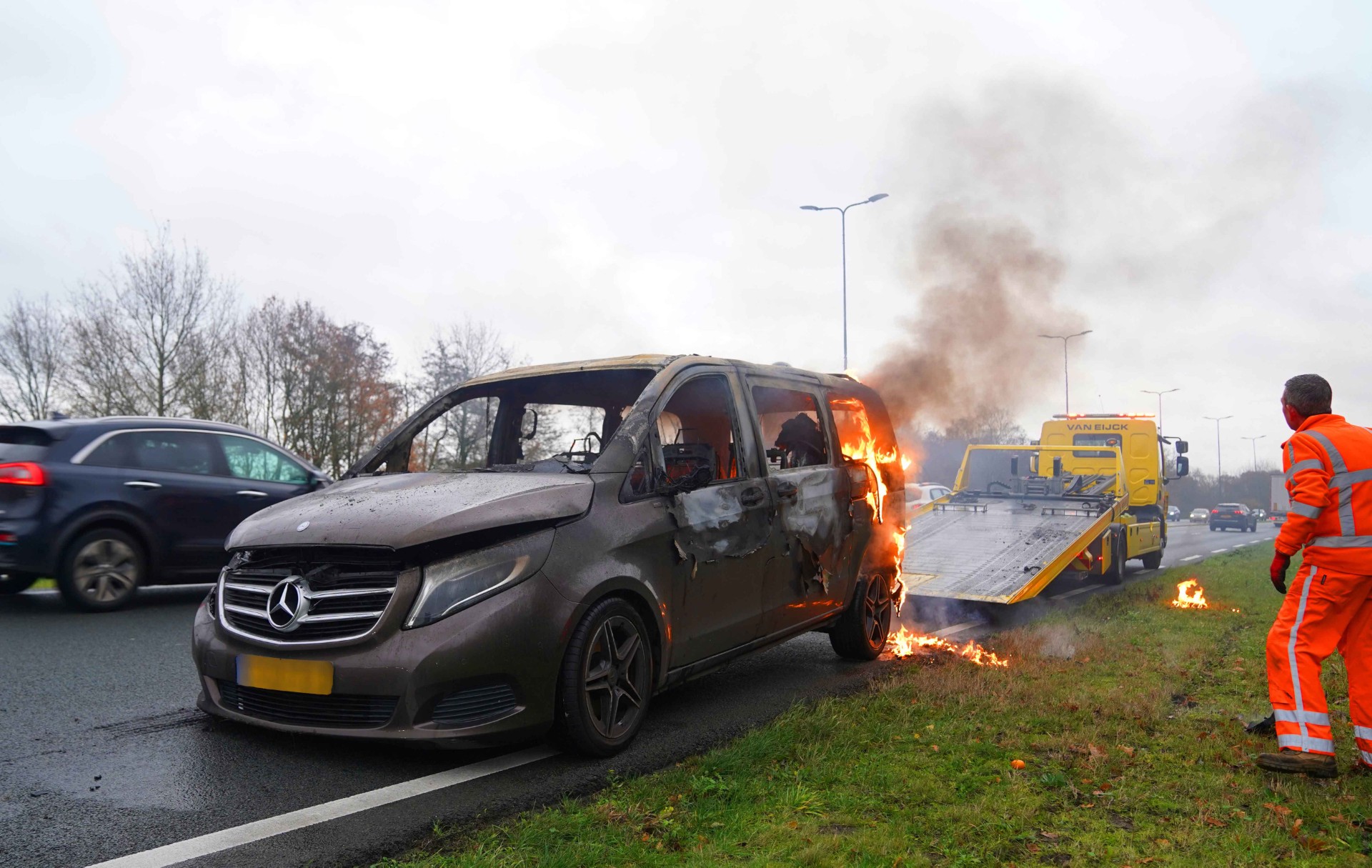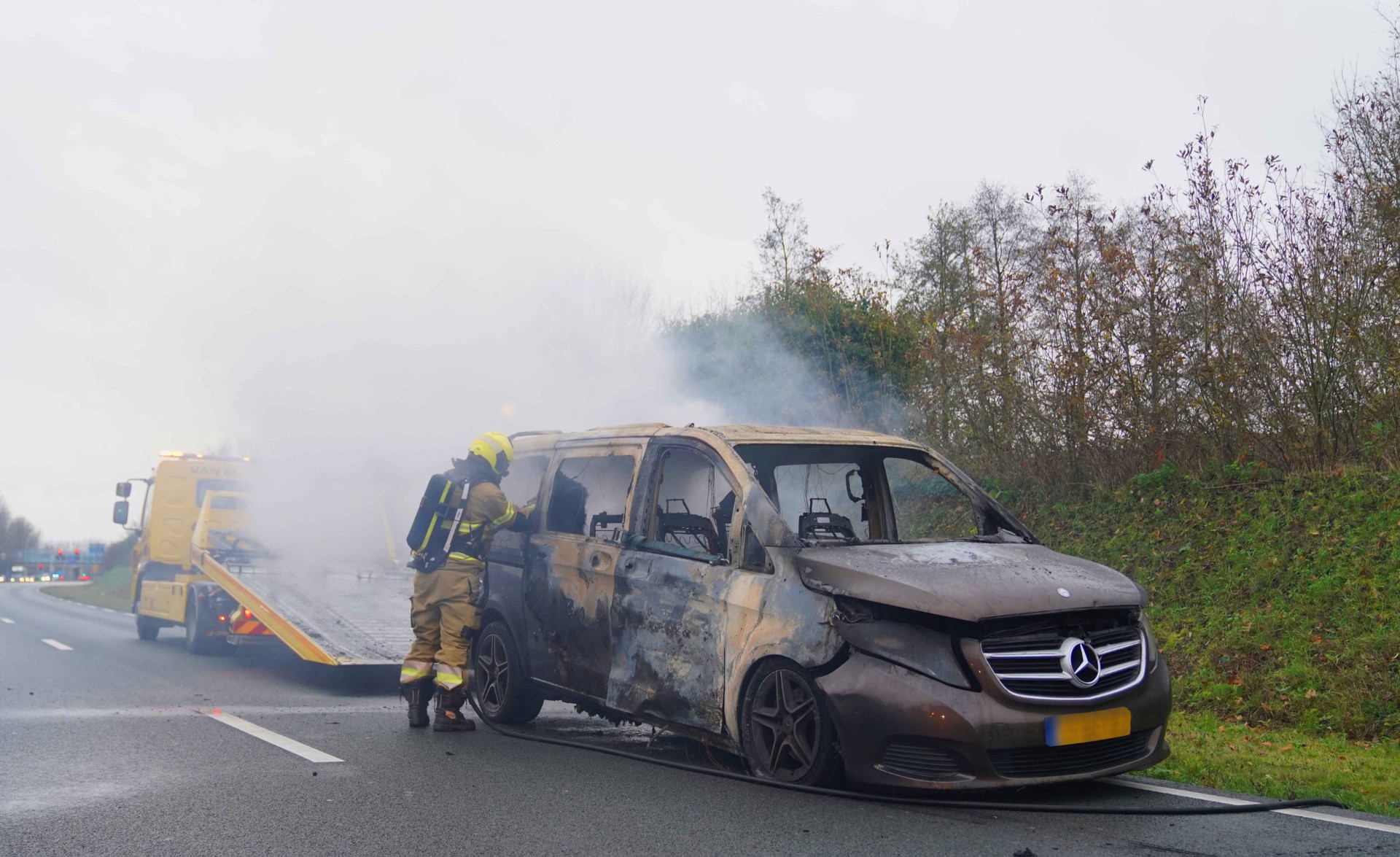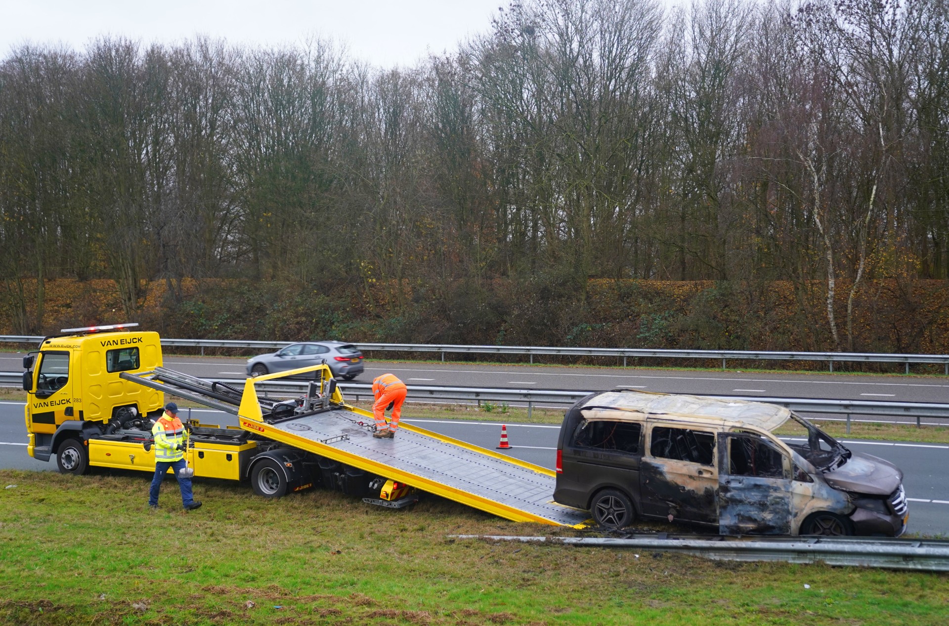 De berger kon het busje op tijd van zijn wagen halen, waarna de brandweer opnieuw is ingezet om het vuur te blussen. Een rijstrook op de A59 werd eerder afgesloten om het voertuig veilig te kunnen bergen.
