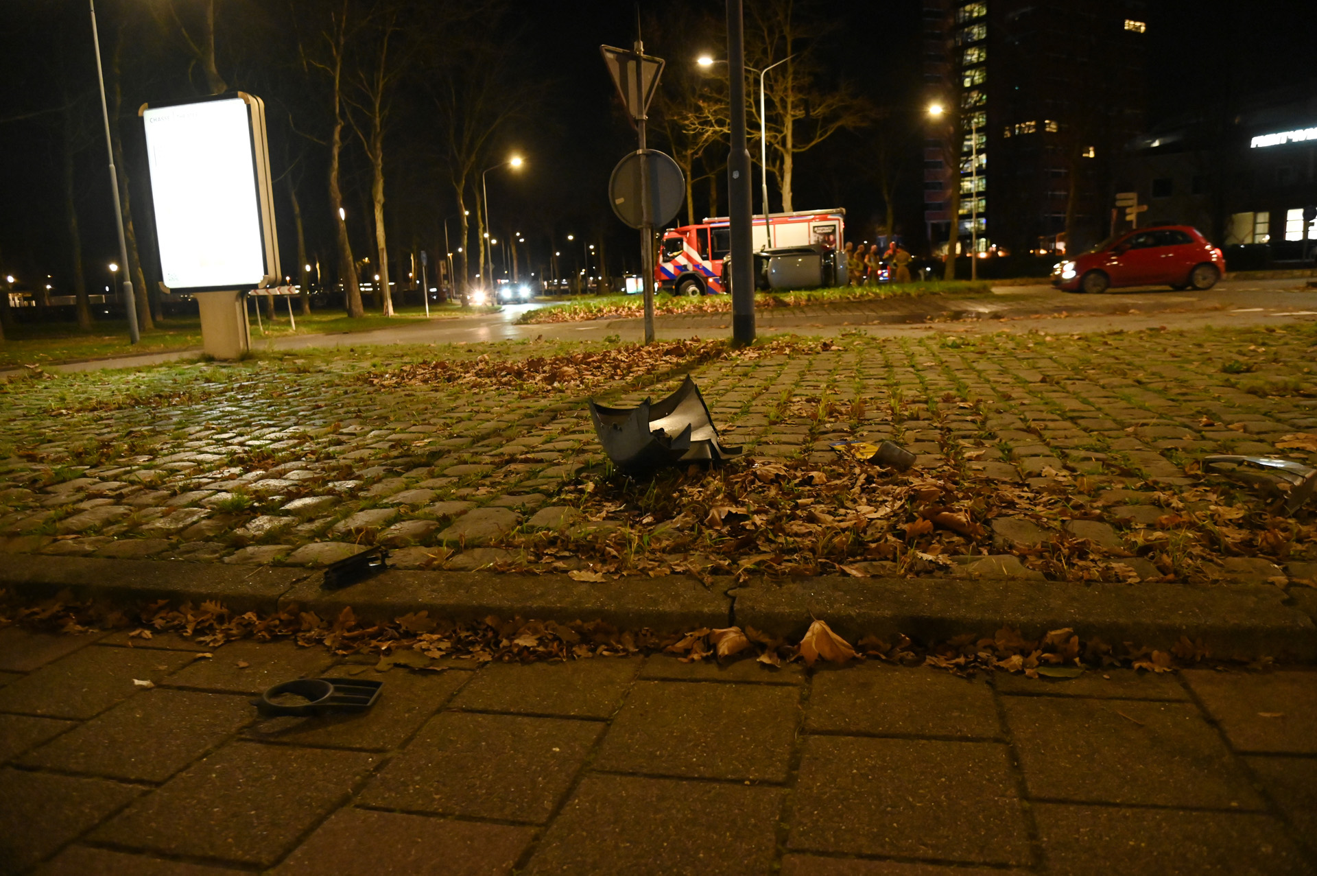 De auto reed onderweg twee straatnaamborden omver en schoot over twee vluchtheuvels voordat het voertuig kantelde en tegen de paal tot stilstand kwam. De bestuurder kon zelfstandig uit het voertuig komen en bleef ongedeerd. De brandweer kwam ter plaatse om de situatie veilig te stellen.