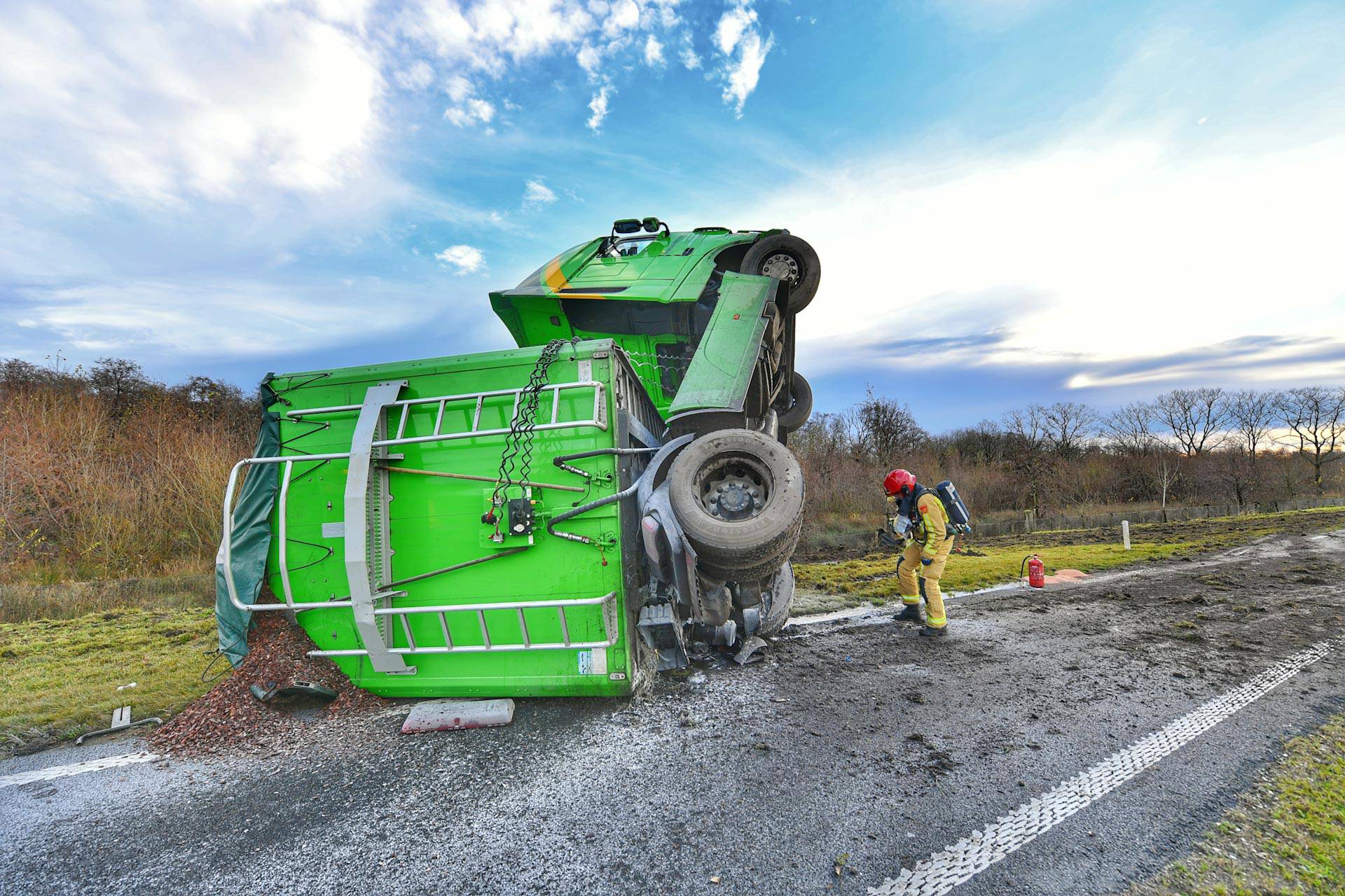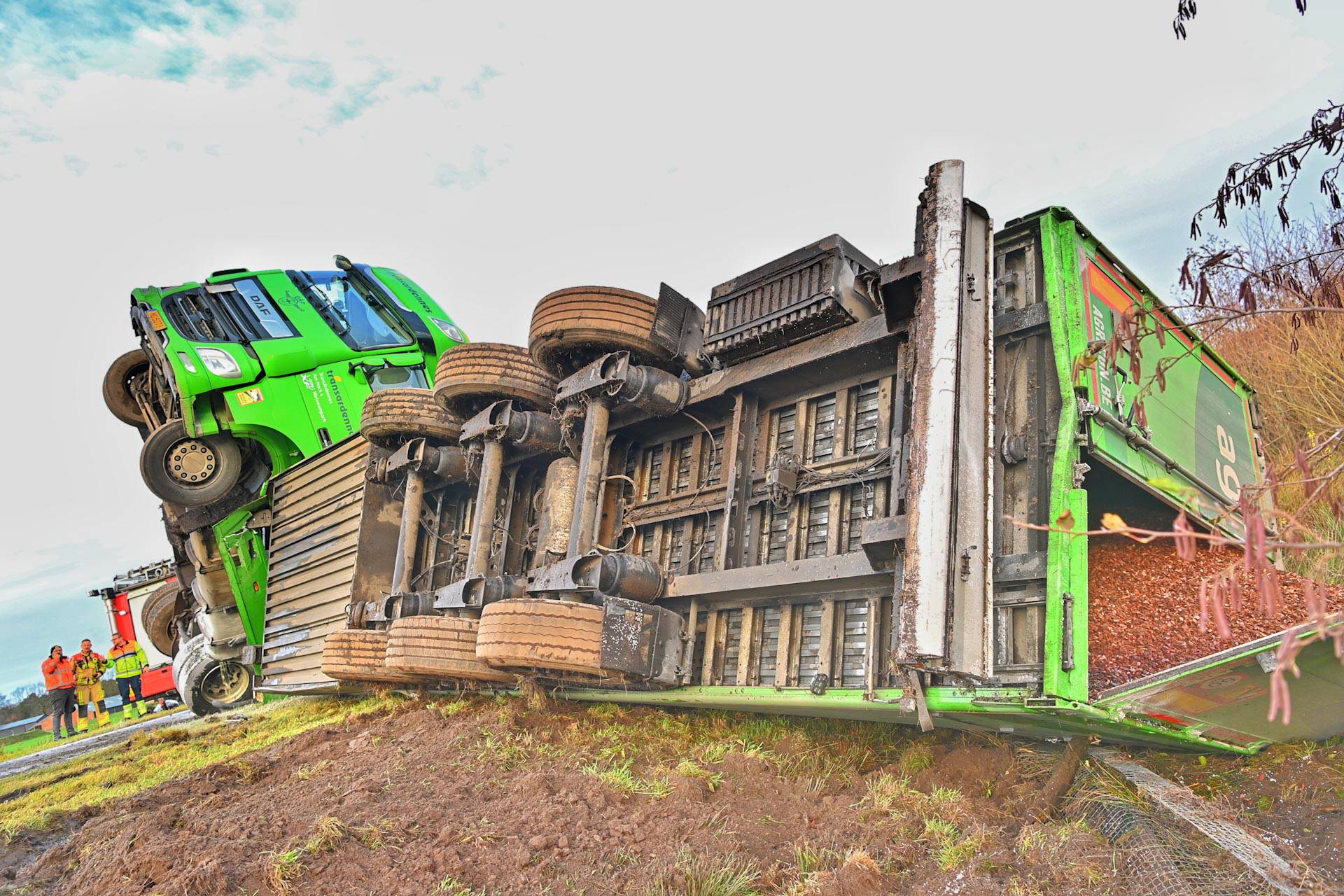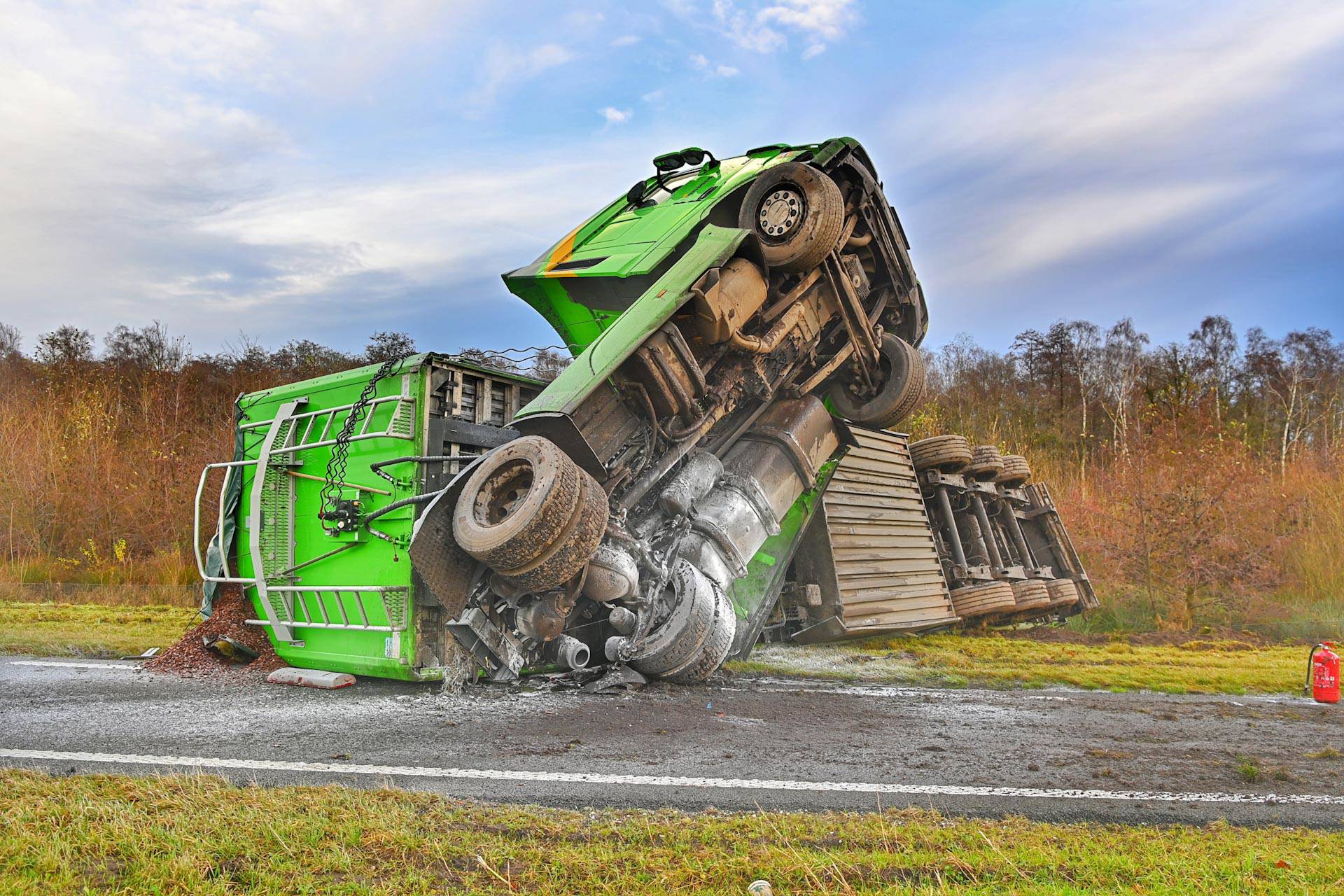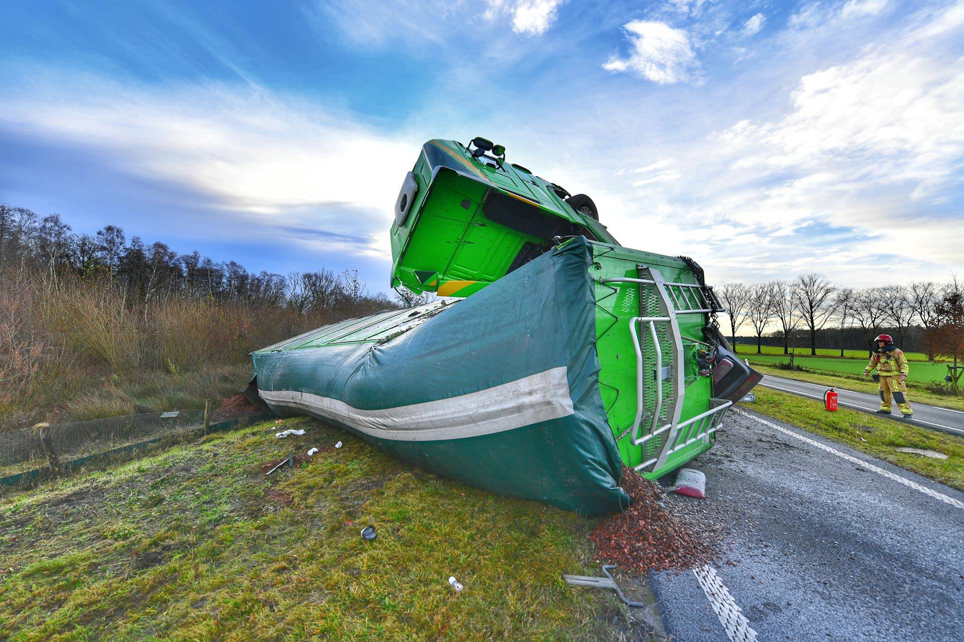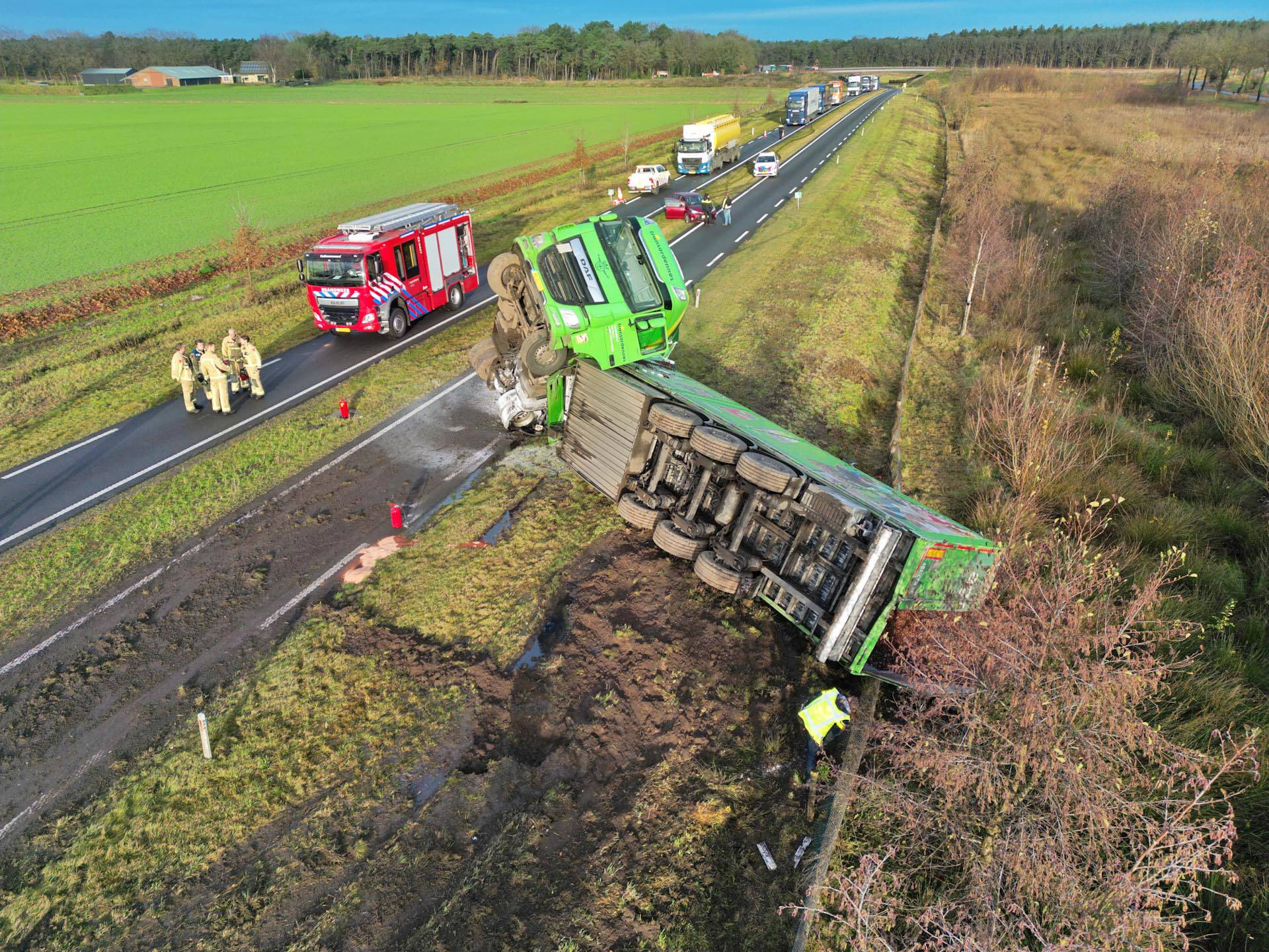 Vrachtwagen met houtsnippers slaat om, weg dicht