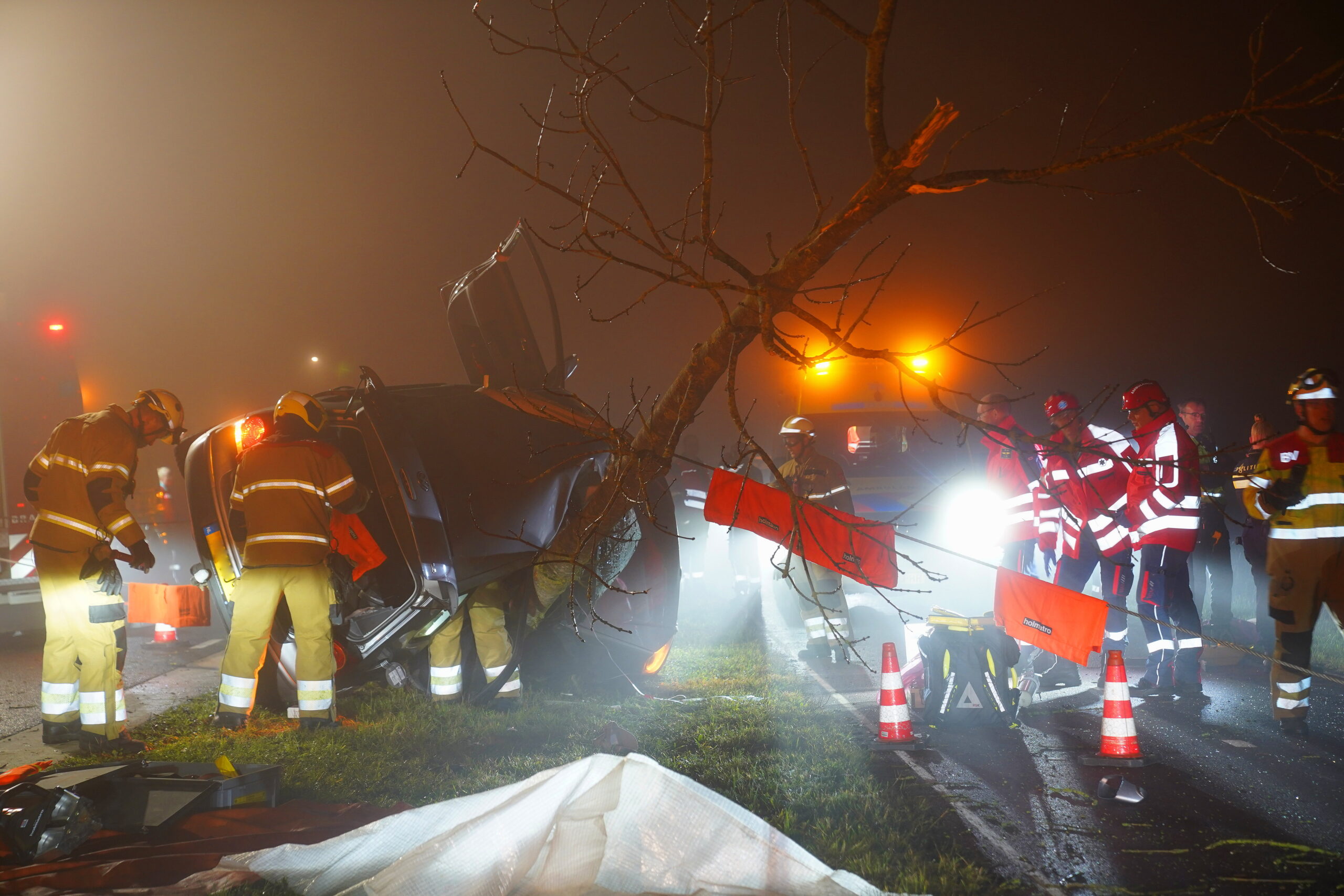 De auto raakte van de weg, belandde in de berm en kwam op de zijkant tegen een boom tot stilstand. Twee inzittenden moesten door de brandweer uit het voertuig worden bevrijd. Bij één slachtoffer duurde de reddingsactie ruim een uur.