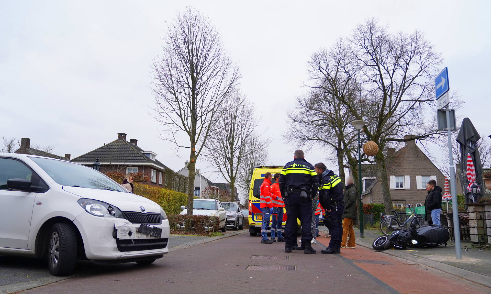 De automobiliste wilde de weg opdraaien toen de scooter, met twee personen erop, tegen de auto botste. De bestuurder van de scooter is met onbekend letsel per ambulance naar het ziekenhuis gebracht. De bijrijder liep lichte verwondingen op en is thuis verzorgd. De automobiliste bleef ongedeerd.