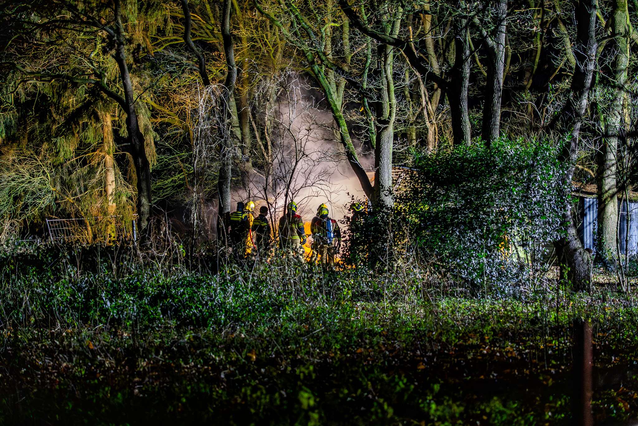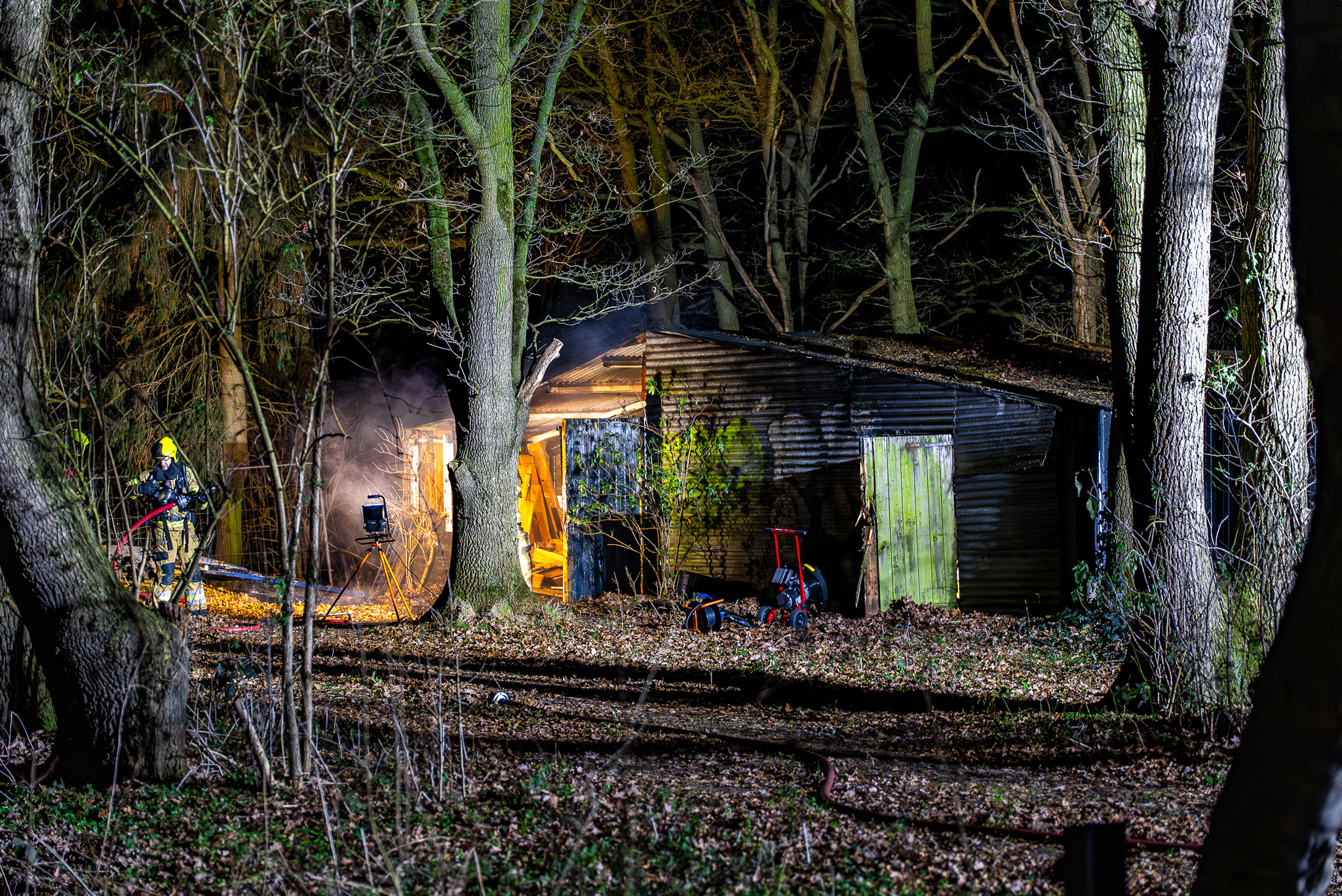 Schuur vliegt in brand in bosgebied