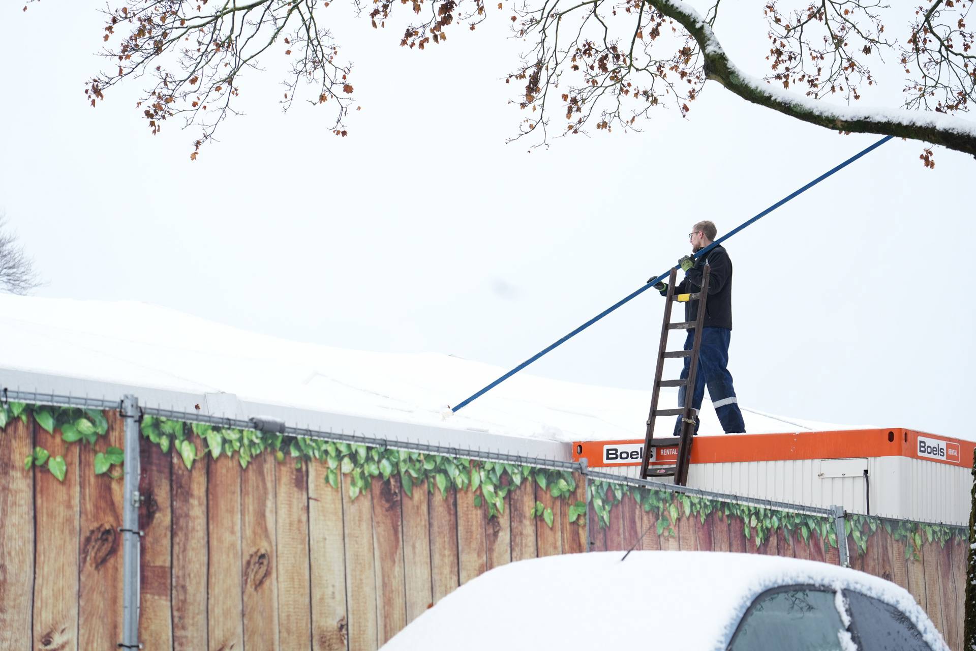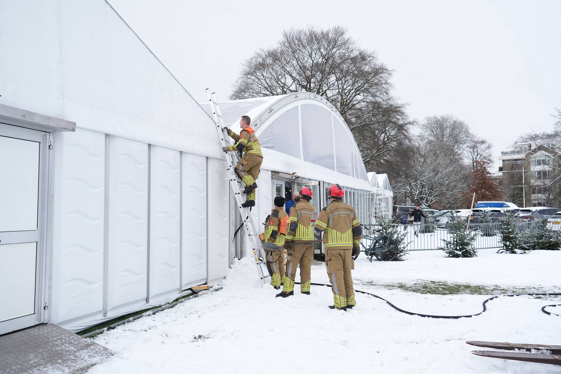 Sinds zaterdagochtend zijn vrijwilligers en brandweerlieden druk bezig om het dak sneeuwvrij te maken. Met man en macht wordt geprobeerd te voorkomen dat de ophoping van sneeuw tot schade leidt aan de overkapping van de tijdelijke ijsbaan.