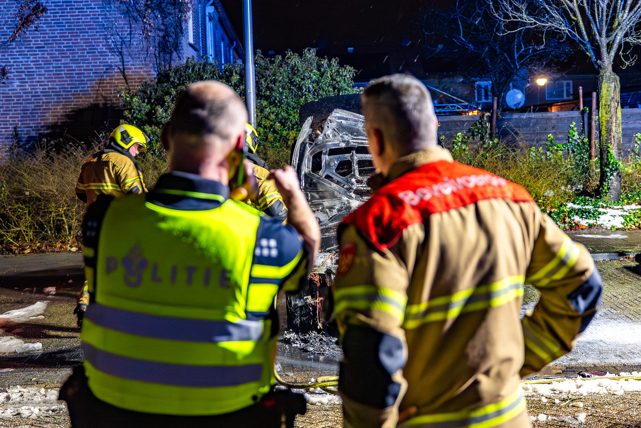 De voorzijde van de auto is volledig verwoest door de vlammen en ook het interieur raakte zwaar beschadigd. Mogelijk heeft een nabij geparkeerde auto lichte lakschade opgelopen door de hitte van de brand.