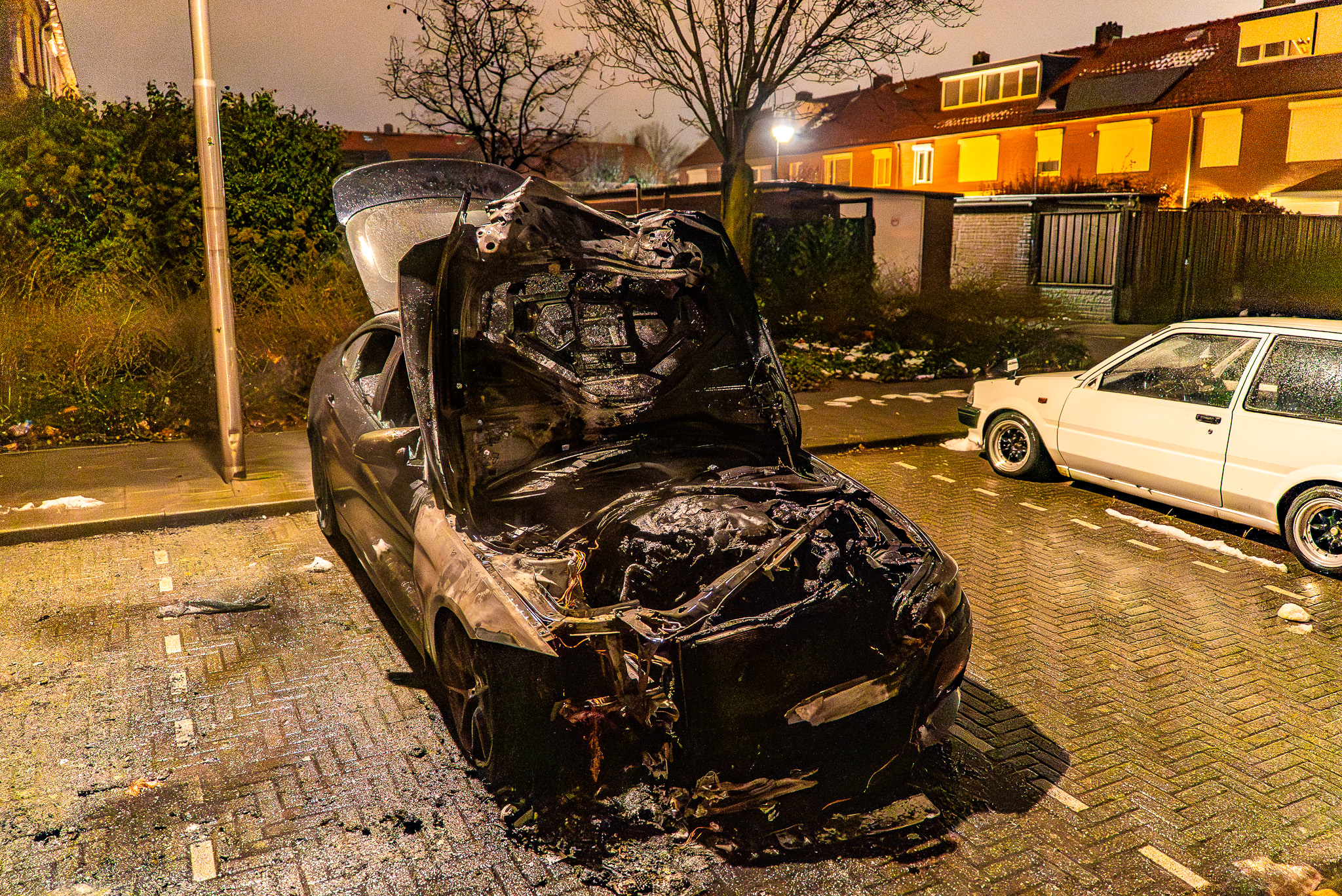De voorzijde van de auto is volledig verwoest door de vlammen en ook het interieur raakte zwaar beschadigd. Mogelijk heeft een nabij geparkeerde auto lichte lakschade opgelopen door de hitte van de brand.