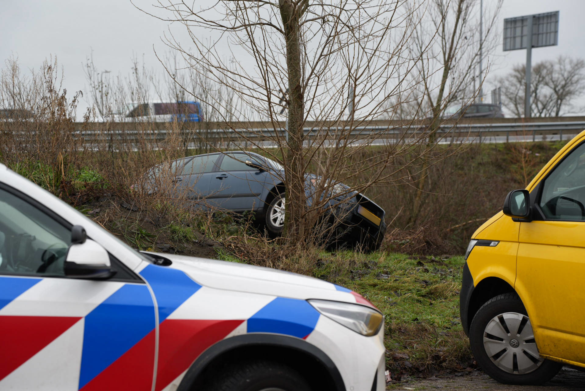 Het voertuig ging over een dijk en werd gelanceerd, waarna het aan de andere kant tot stilstand kwam. De bestuurder kon zelfstandig uitstappen en raakte niet gewond.