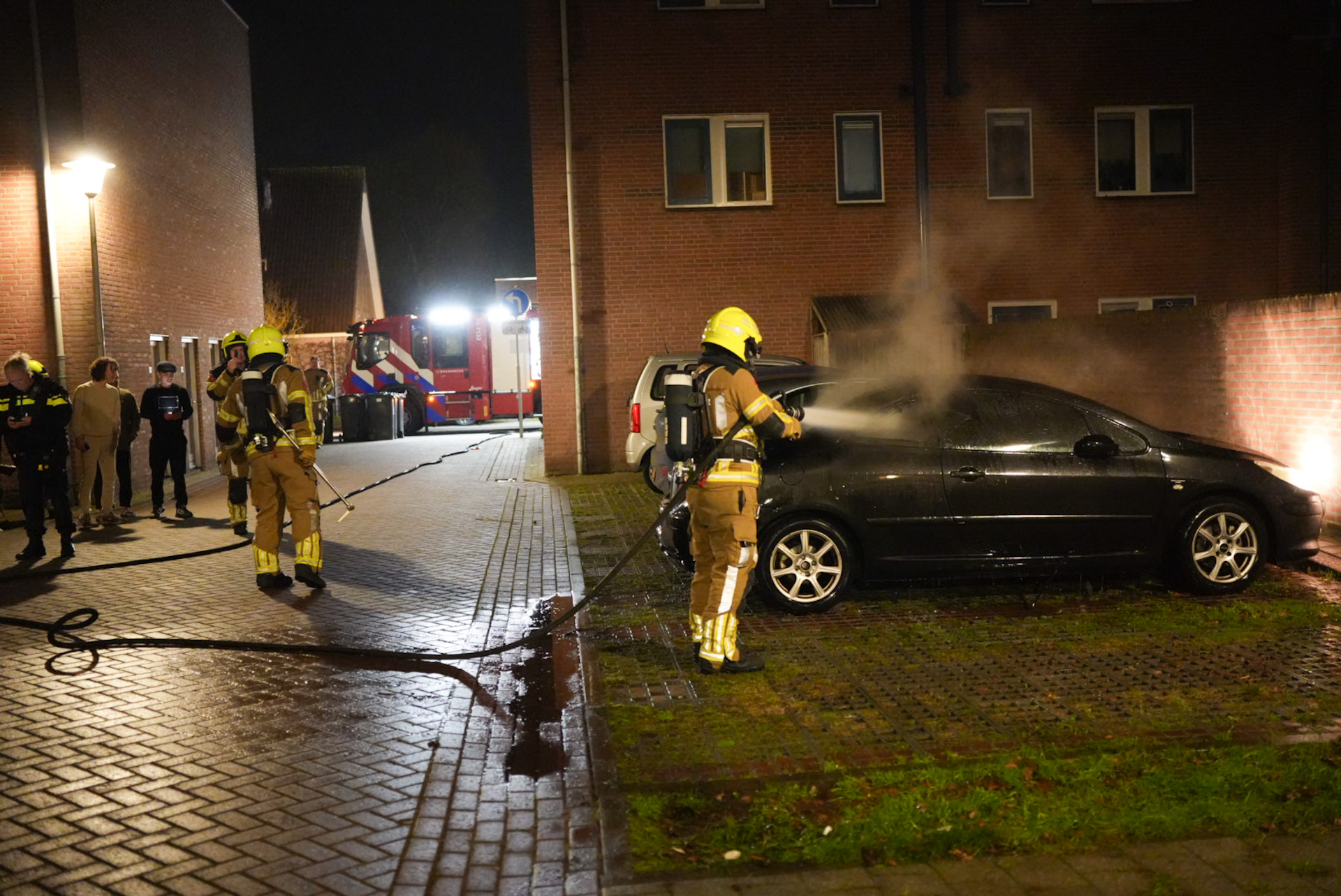 Bij aankomst bleek een achterruit van de auto te zijn ingeslagen. Vermoedelijk is er een brandbare stof naar binnen gegooid, waarna het voertuig van binnenuit in brand vloog. De brandweer wist het vuur te blussen, maar de auto is volledig verwoest.