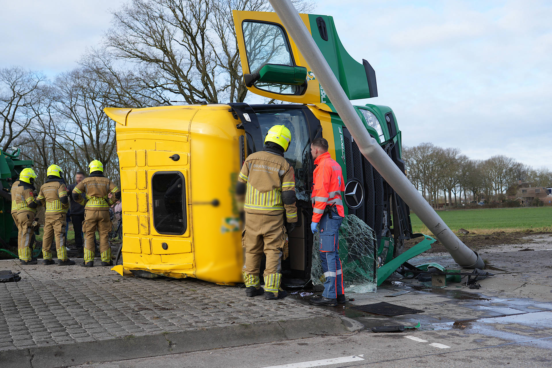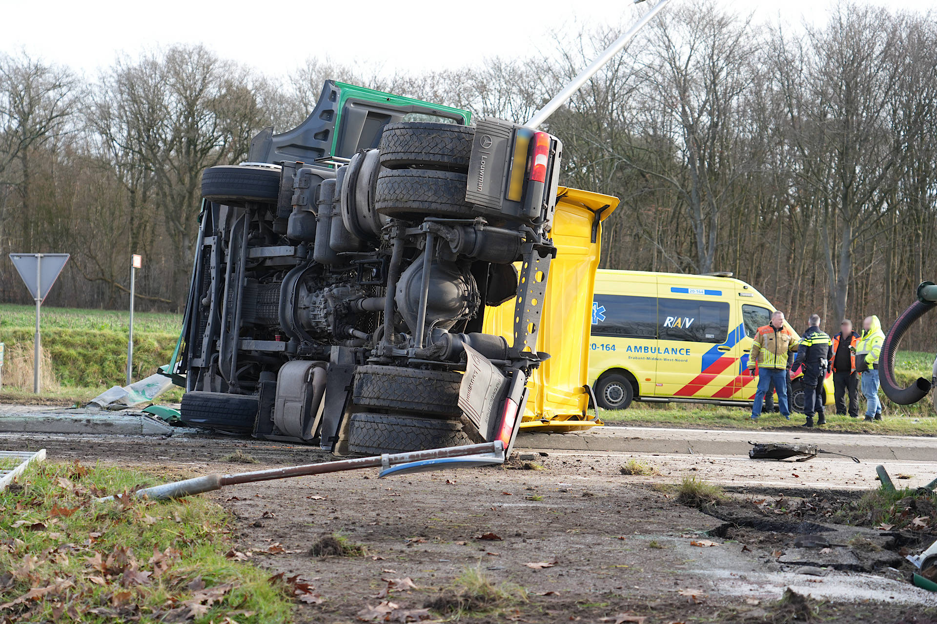 Vrachtwagen kantelt na verlies van controle, chauffeur naar ziekenhuis