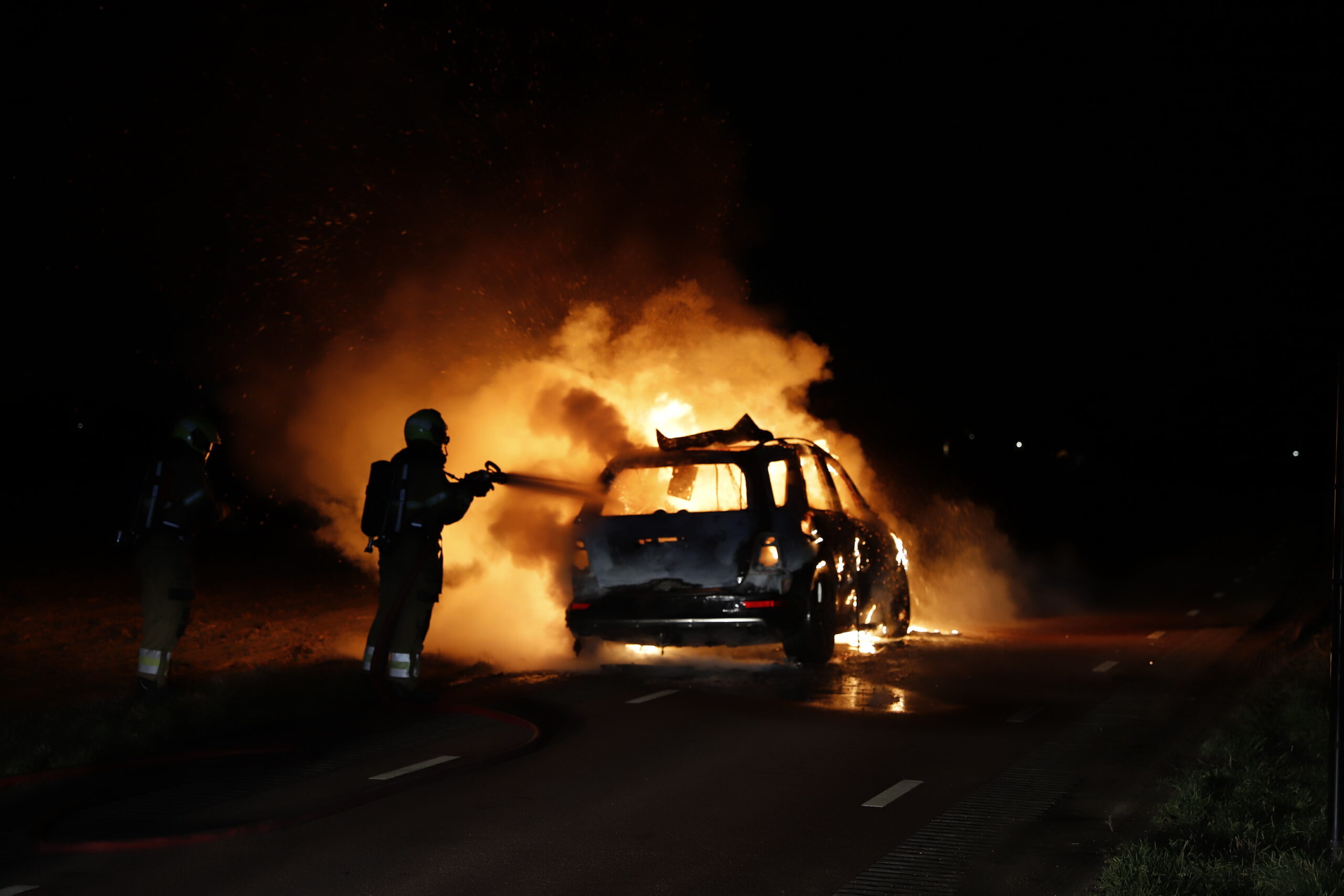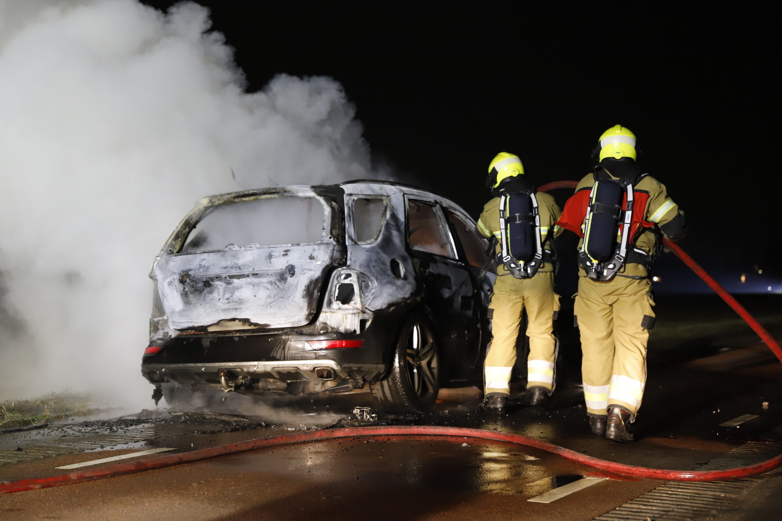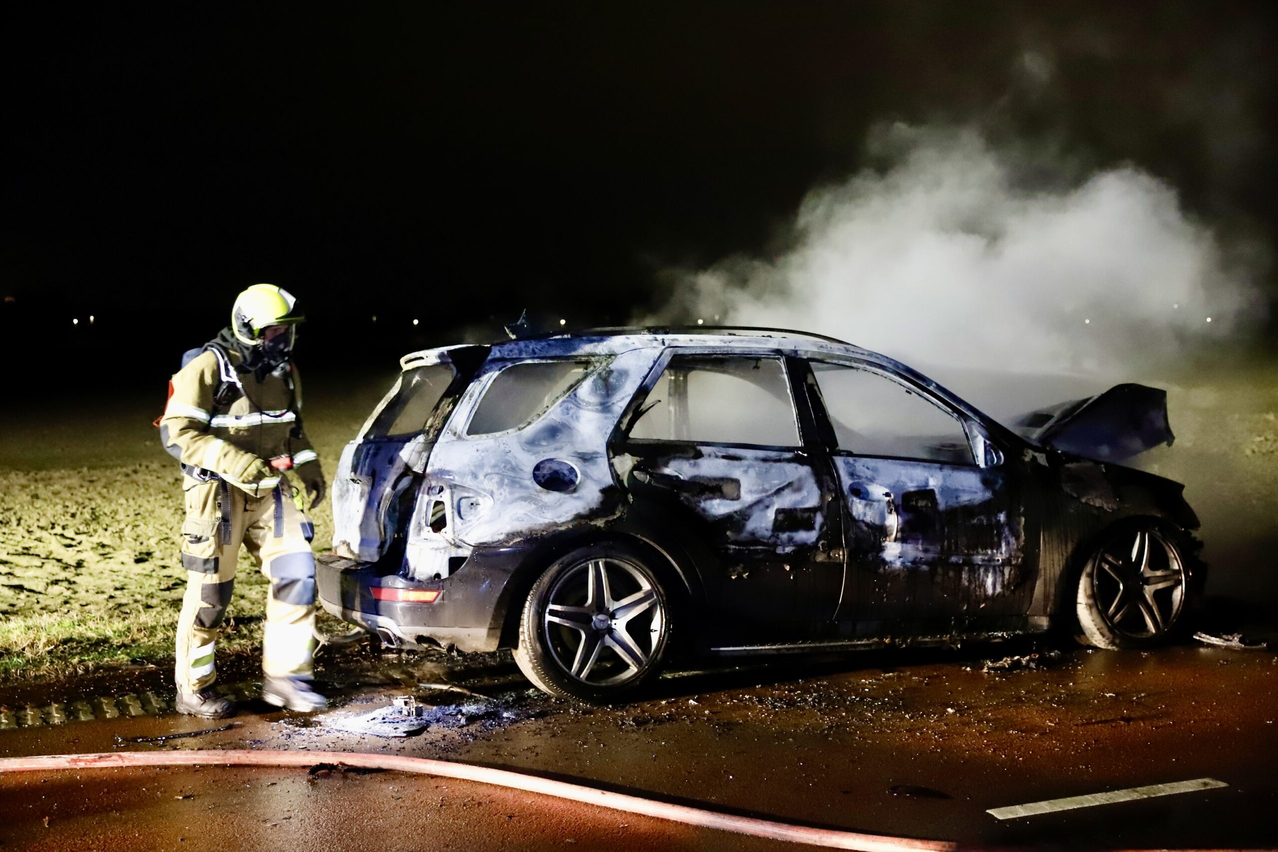 Bij aankomst stond het voertuig al in lichterlaaie. De bestuurder had de auto op tijd aan de kant weten te zetten en kon het voertuig veilig verlaten. Ondanks de inzet van de brandweer brandde de auto volledig uit.