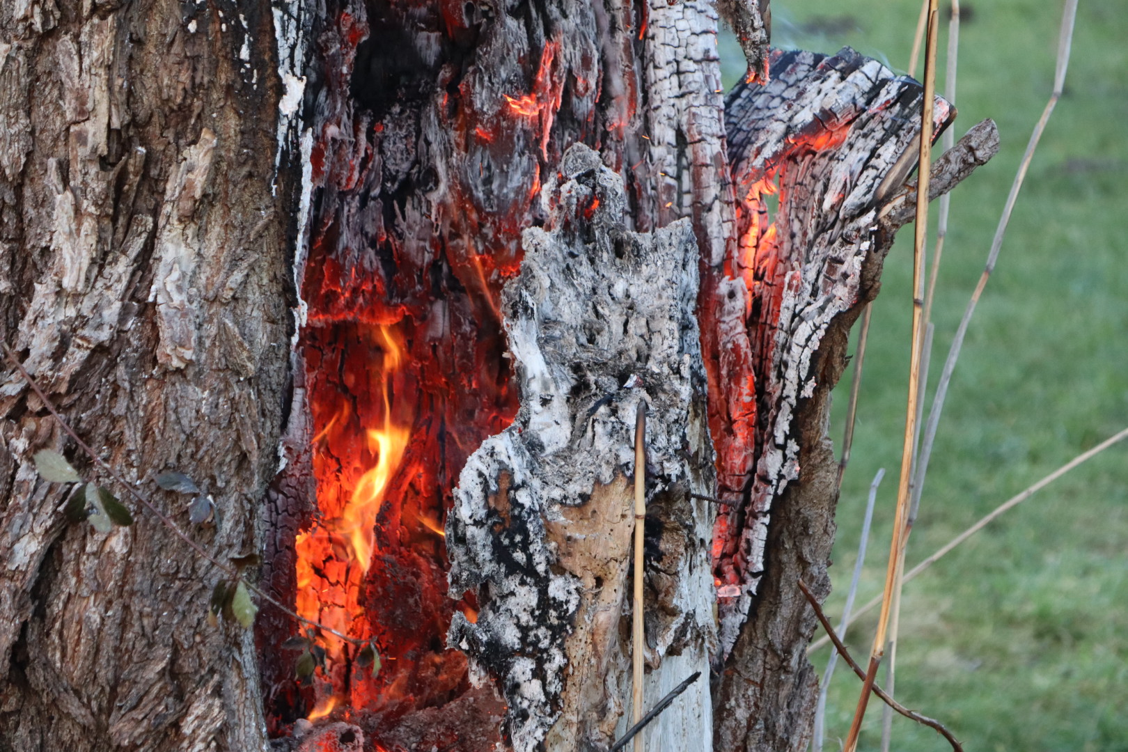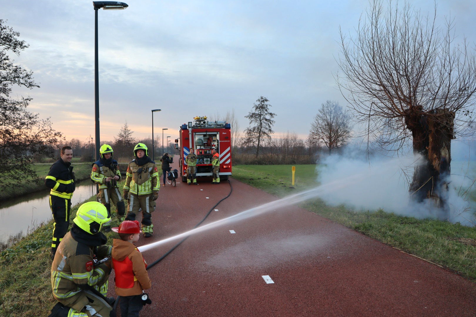 Kindje in brandweerkleding helpt brandweer bij blussen brandende knotwilg