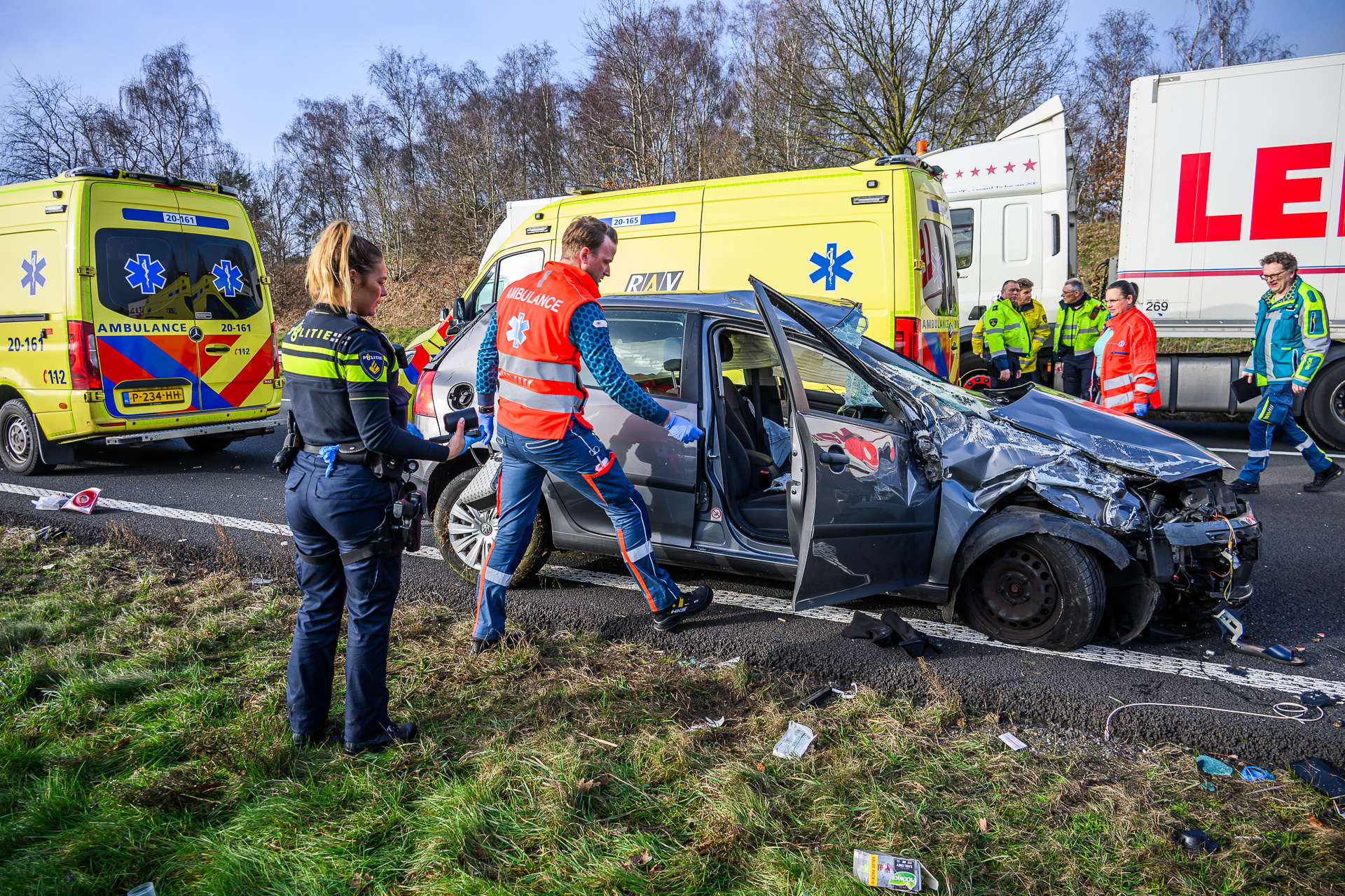 Snelweg volledig afgesloten na ongeval, auto over de kop
