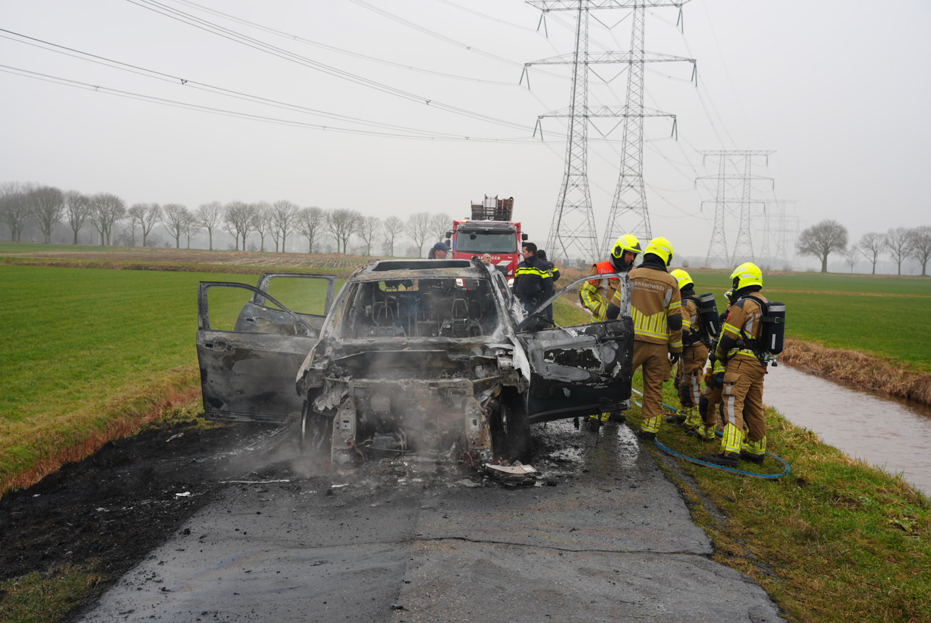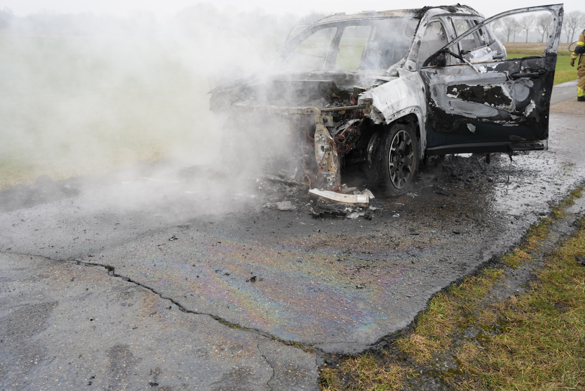 ‘S-GRAVENMOER – Twee inzittenden van een Jeep zijn maandagmiddag ongedeerd gebleven nadat hun voertuig vlam vatte op de Vogelenzangweg, in de polder tussen ’s Gravenmoer en Waspik. Kort daarvoor hoorden zij een harde klap, waarna de auto vrijwel direct in brand vloog.