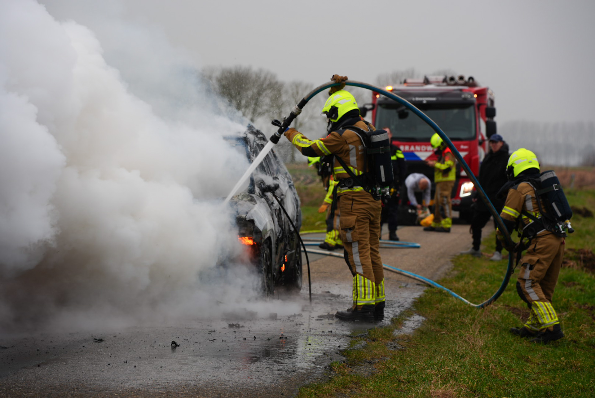 ‘S-GRAVENMOER – Twee inzittenden van een Jeep zijn maandagmiddag ongedeerd gebleven nadat hun voertuig vlam vatte op de Vogelenzangweg, in de polder tussen ’s Gravenmoer en Waspik. Kort daarvoor hoorden zij een harde klap, waarna de auto vrijwel direct in brand vloog.