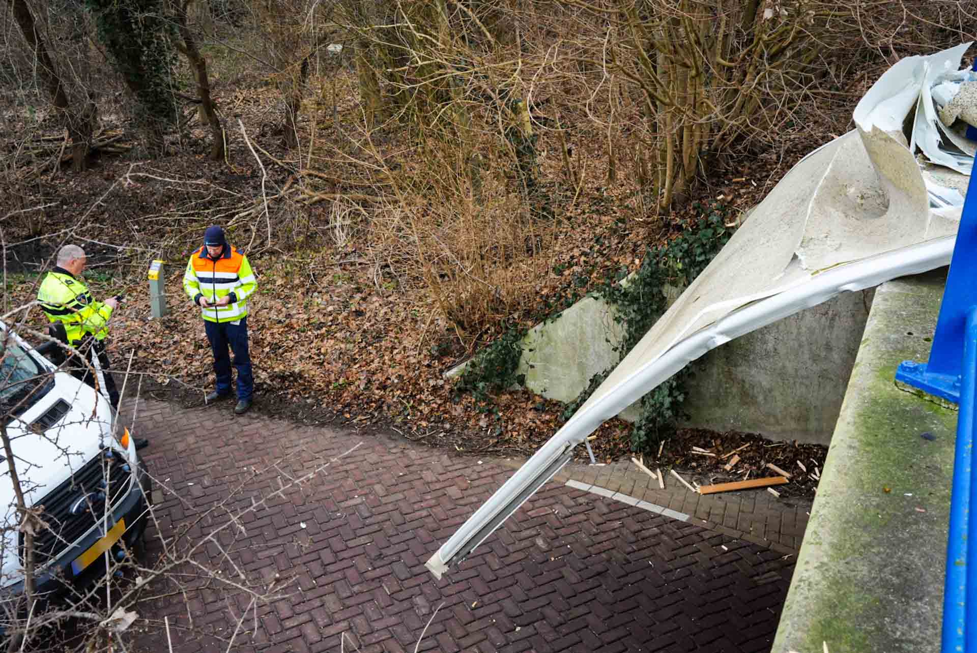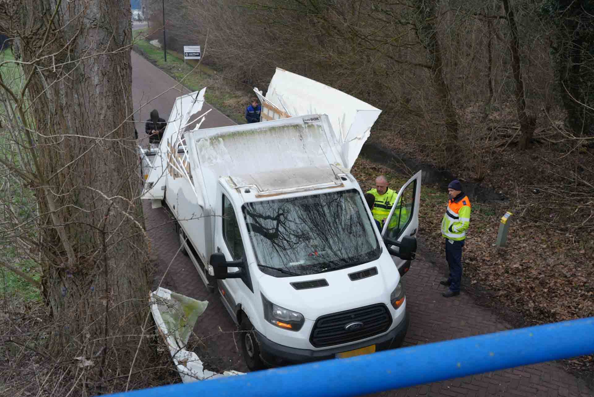 De klap was fors: van de bakwagen bleef weinig over. Brokstukken lagen verspreid over de weg en het dak van het voertuig raakte bekneld tussen het viaduct en de reling. De bestuurder bleef ongedeerd, maar kreeg wel een proces-verbaal.