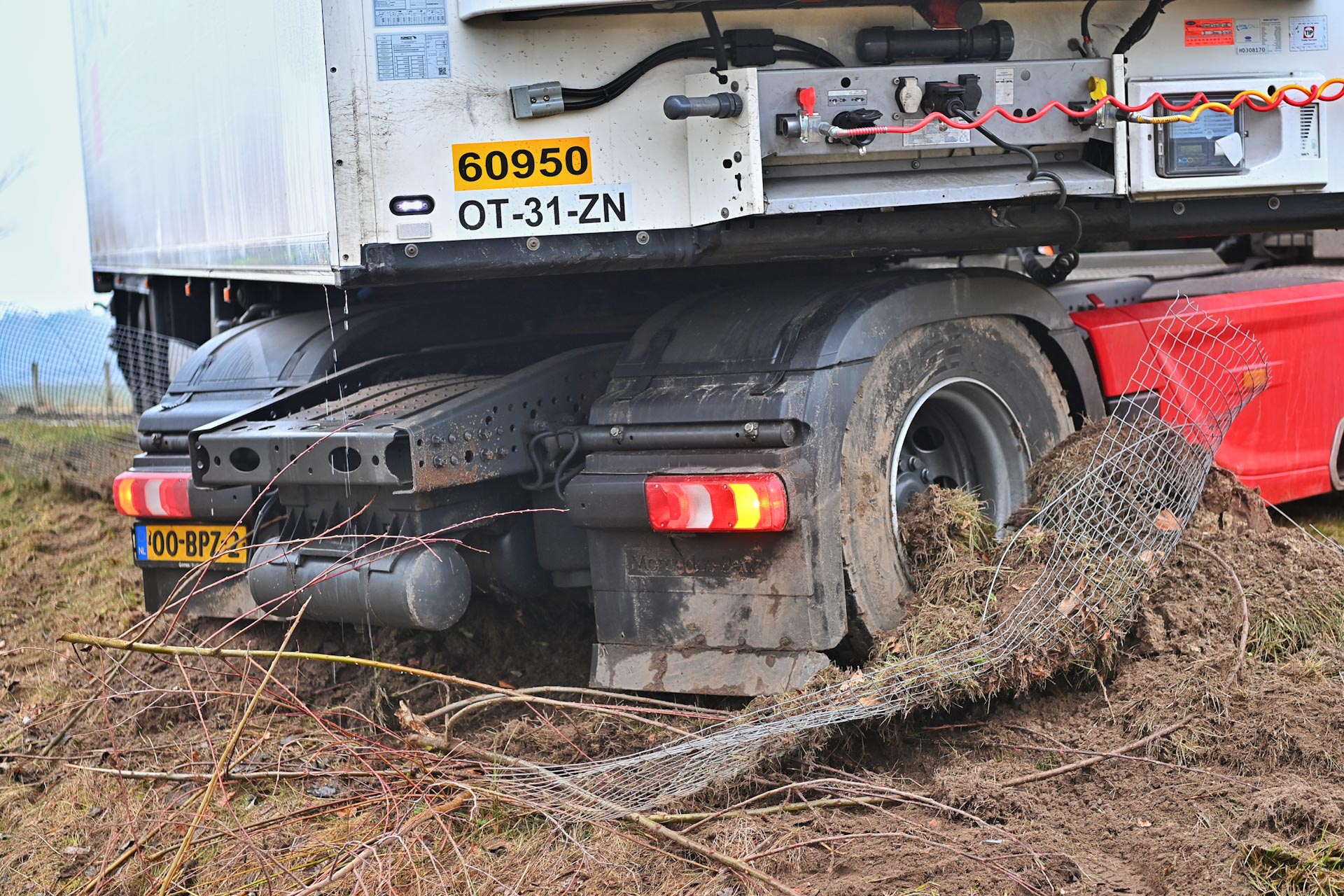 Een berger kwam ter plaatse om de vrachtwagen los te trekken.
