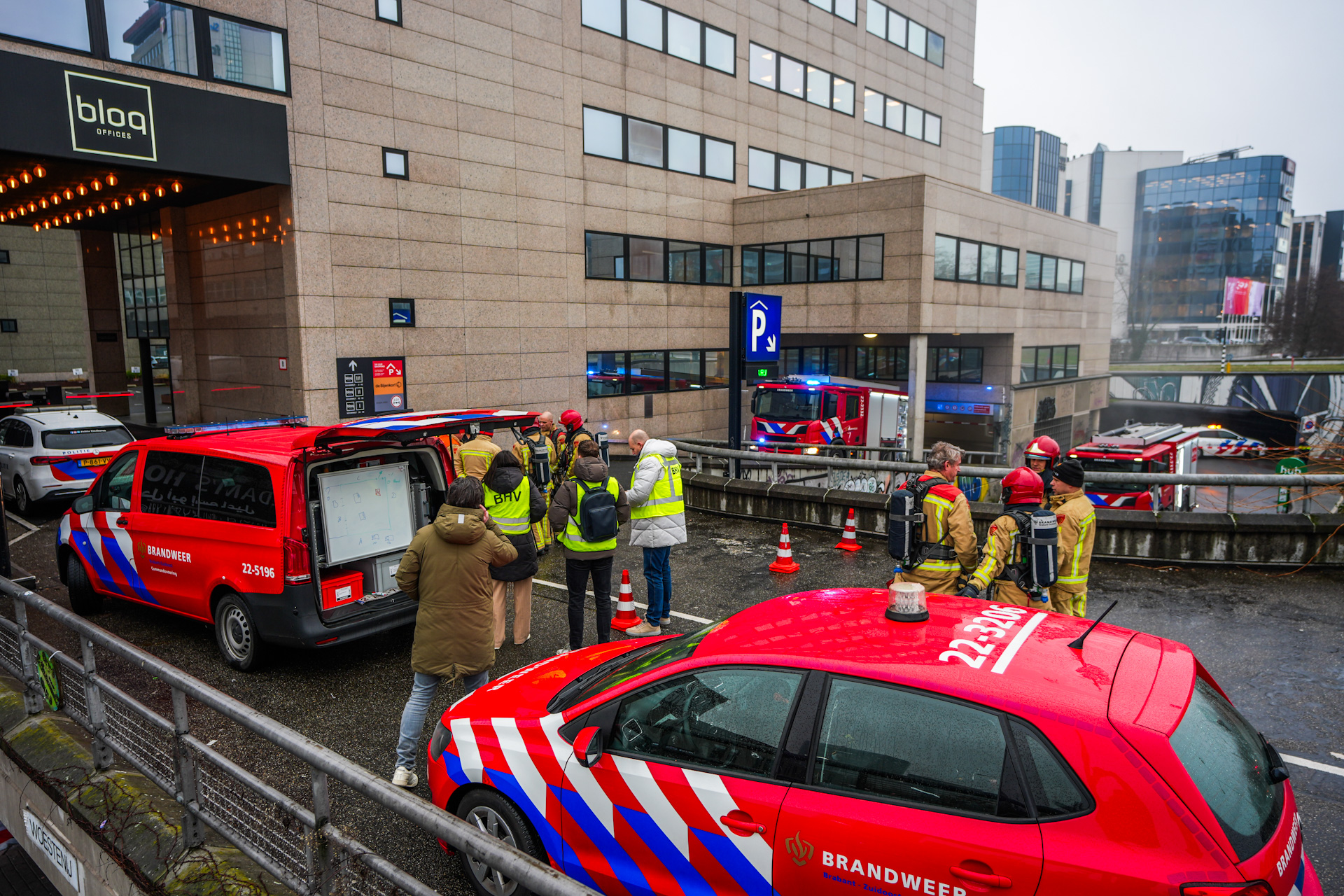 Tijdens de brand verspreidde de rook zich niet alleen door de garage, maar ook naar de bovenliggende verdiepingen. De rook bleef in het gebouw hangen, waardoor meerdere kantoorpanden boven de garage zijn ontruimd. Een deel van de directe omgeving is afgezet.