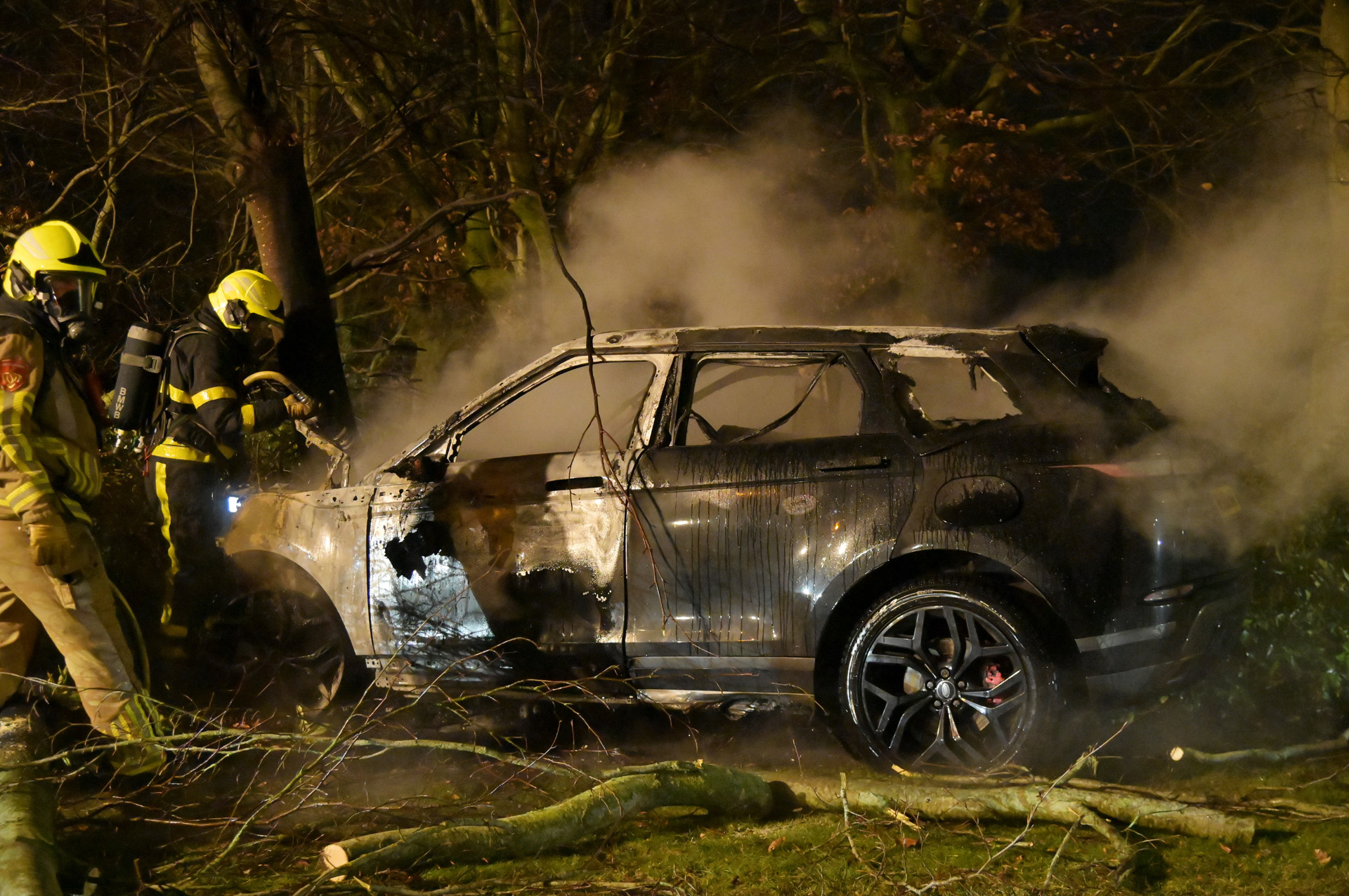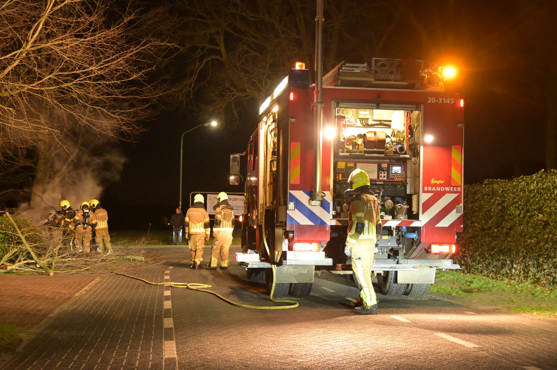 De brandweer kwam ter plaatse om het vuur te blussen en snoeide enkele bomen om bij de auto te kunnen komen. Twee ambulances werden opgeroepen, maar hoefden niet in actie te komen.