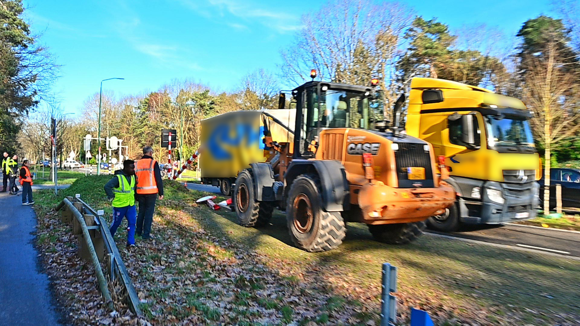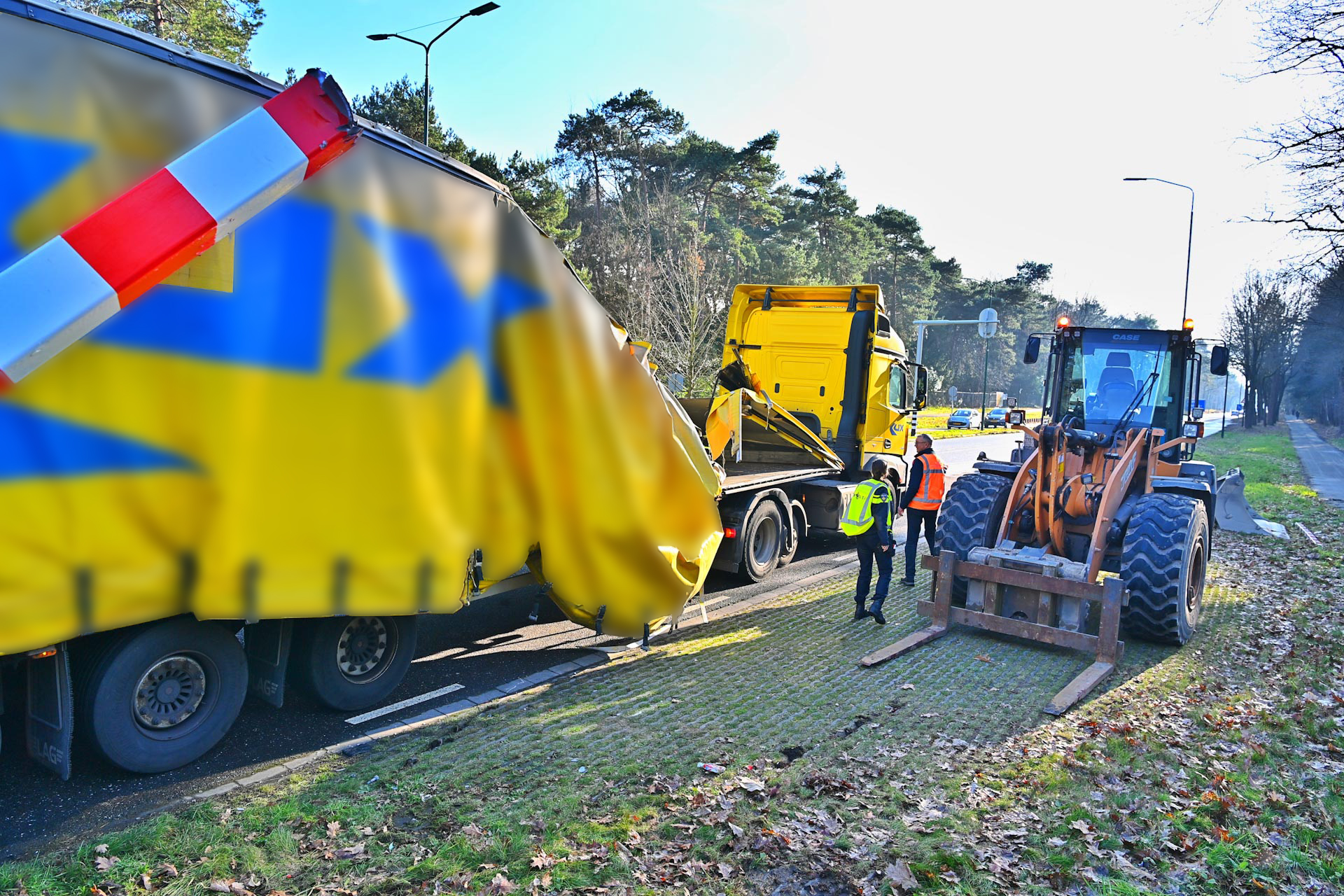Het verkeer op de Valkenswaardseweg wordt omgeleid. De beschadigde vrachtwagencombinatie zal met een dieplader worden afgevoerd.