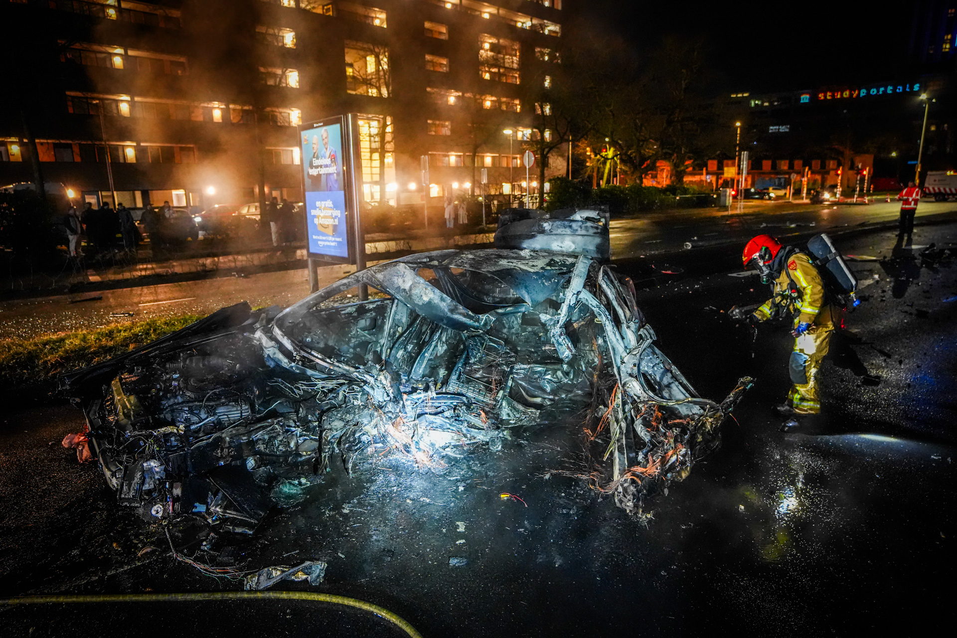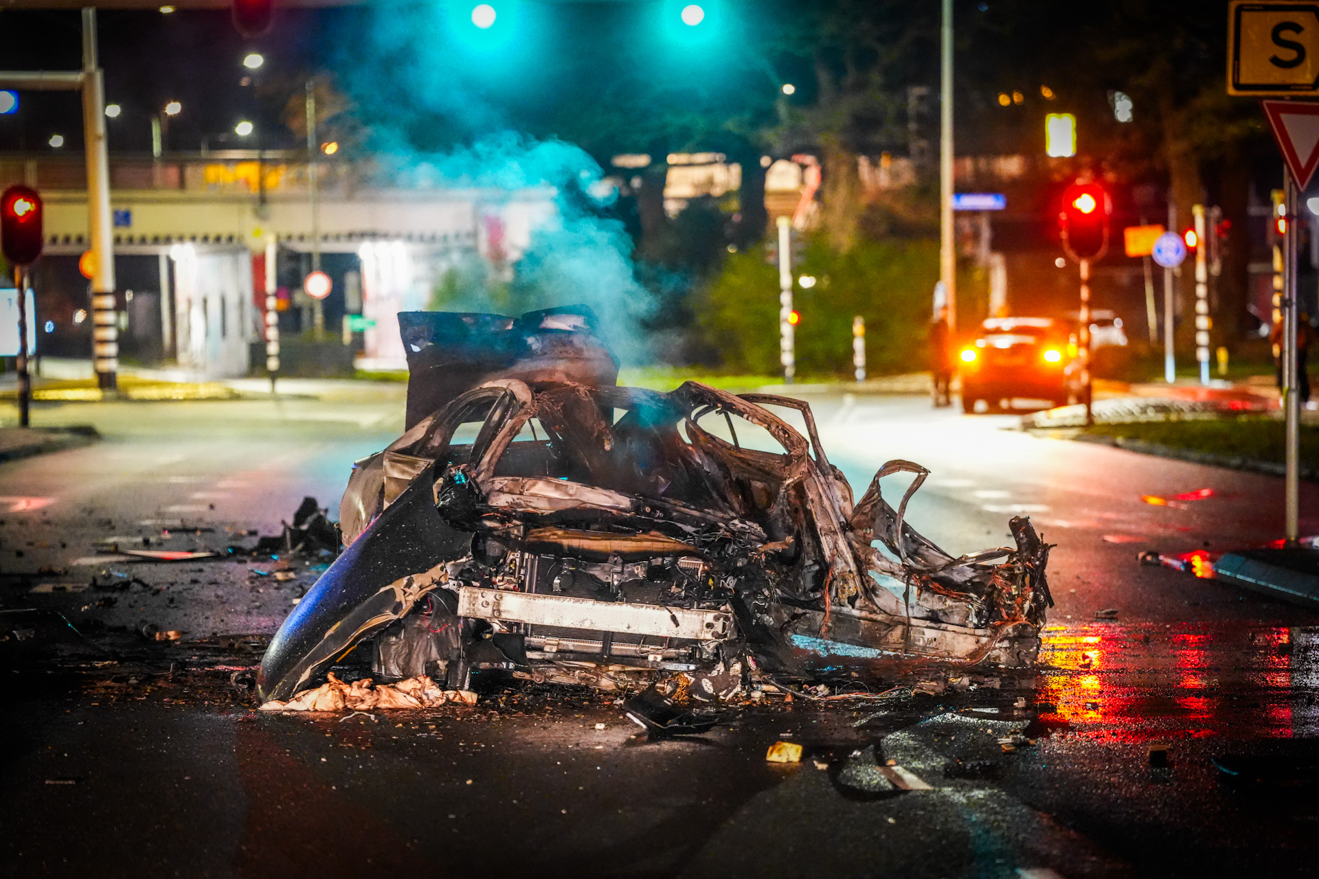 De klap was enorm. Brokstukken vlogen tientallen meters weg; een velg met remschijf belandde bijna 100 meter verder op een ventweg en raakte twee geparkeerde auto’s. Toen hulpdiensten arriveerden, was de bestuurder al uit het voertuig. Of hij is uitgeslingerd of door omstanders is bevrijd, is nog onduidelijk. De auto stond bij aankomst volledig in brand en is door de brandweer geblust.