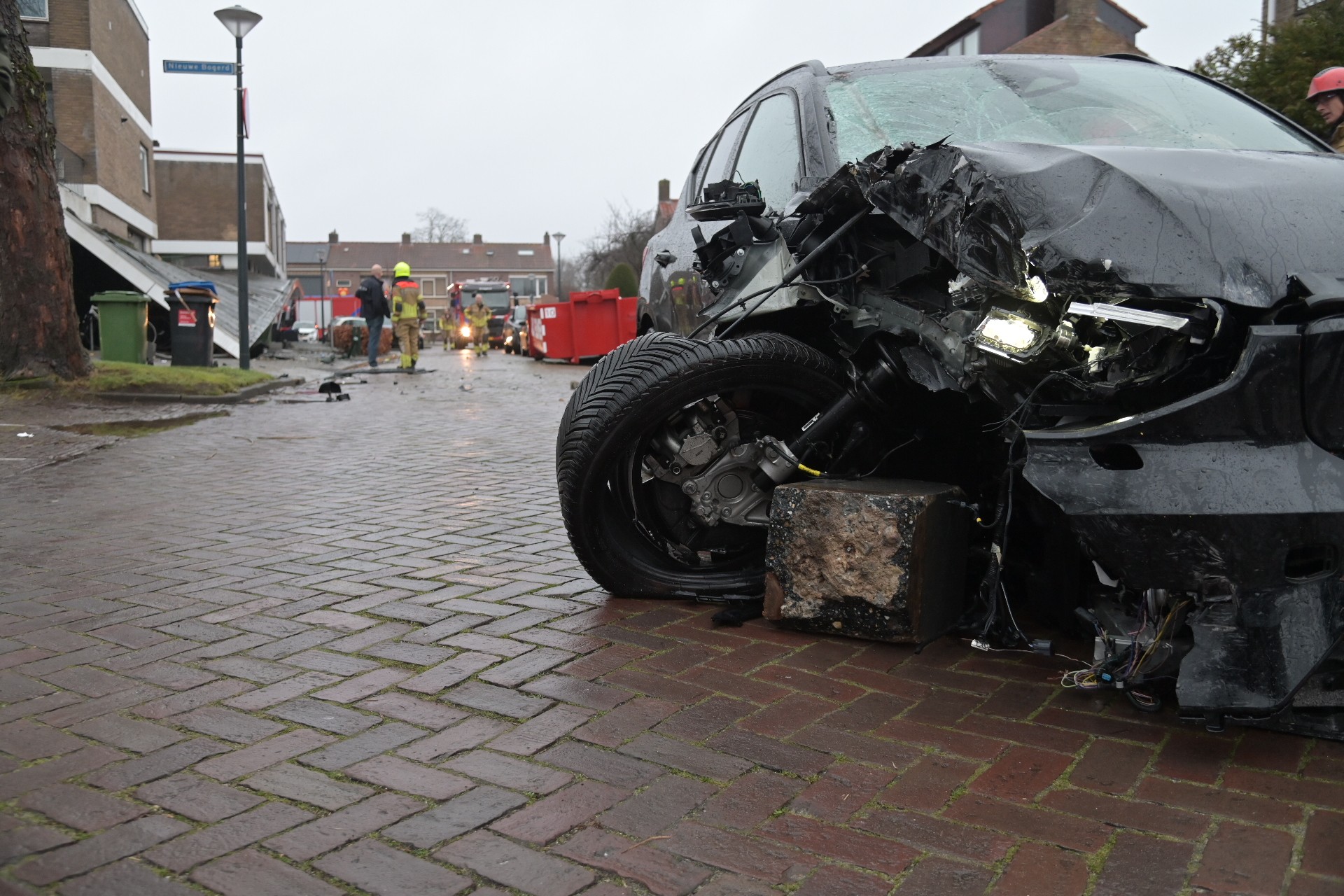 Auto ramt luifel nadat bestuurder over stoep rijdt, luifel ingestort