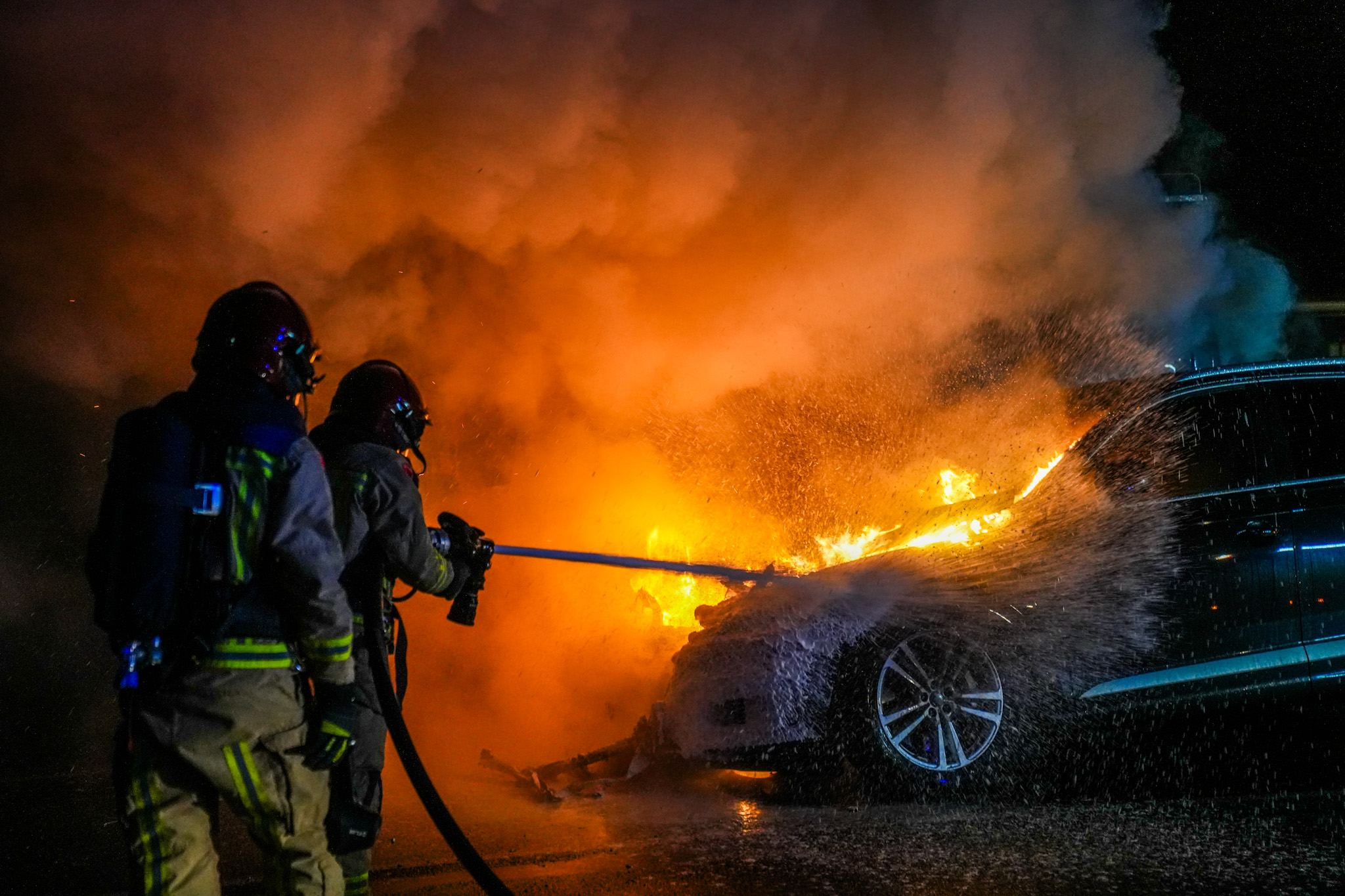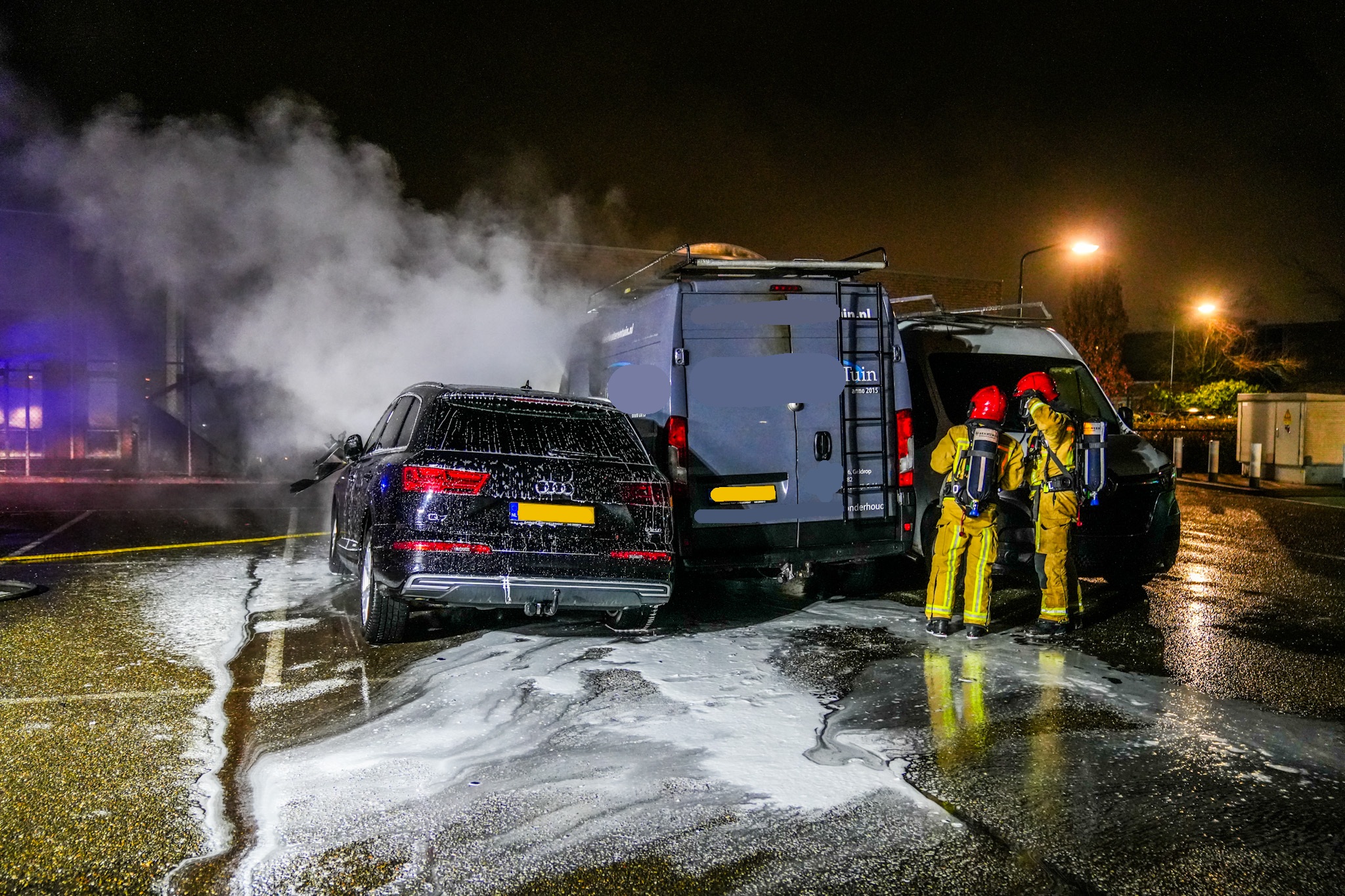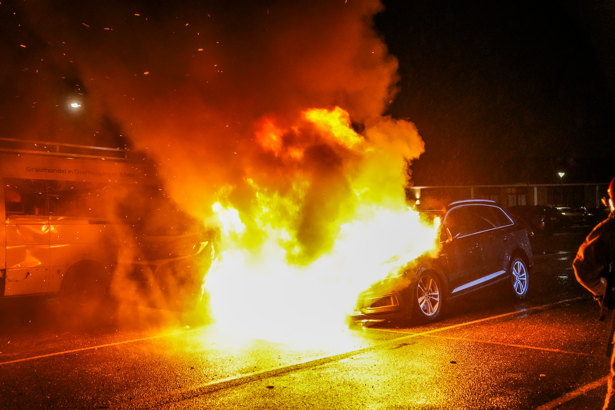 Een van de auto’s, een Audi, stond geparkeerd om de volgende dag gekeurd te worden bij een naastgelegen garage. Beide voertuigen zijn door de brand volledig verloren gegaan.