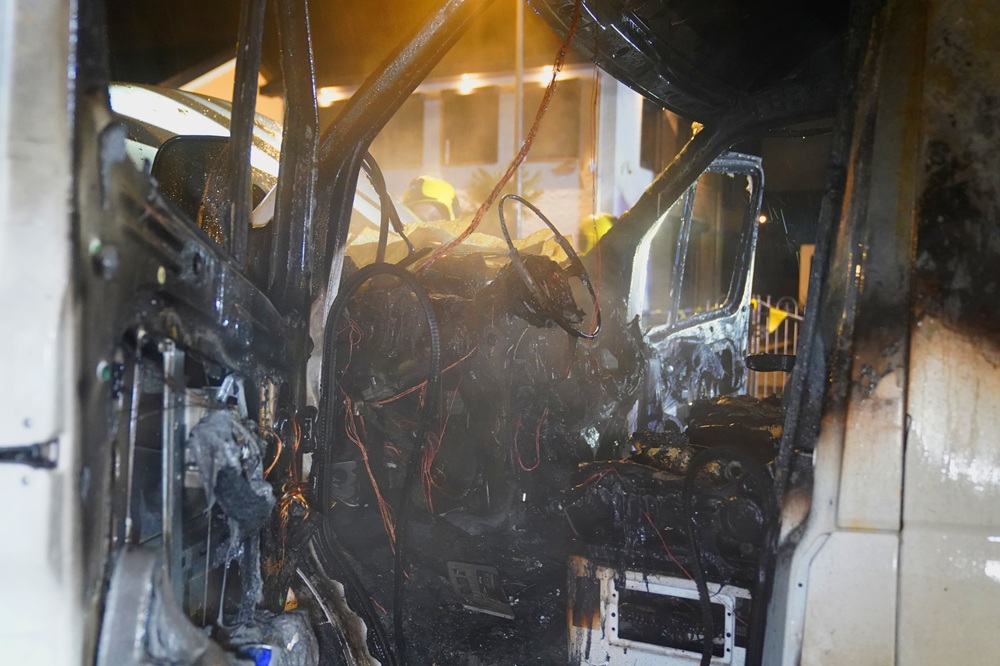 Bij aankomst bleken twee bussen, op ongeveer twintig meter van elkaar, in brand te staan. Het ging om een voertuig van een dakdekker en een bus van een stratenmaker. Beide voertuigen raakten door de brand volledig verloren.