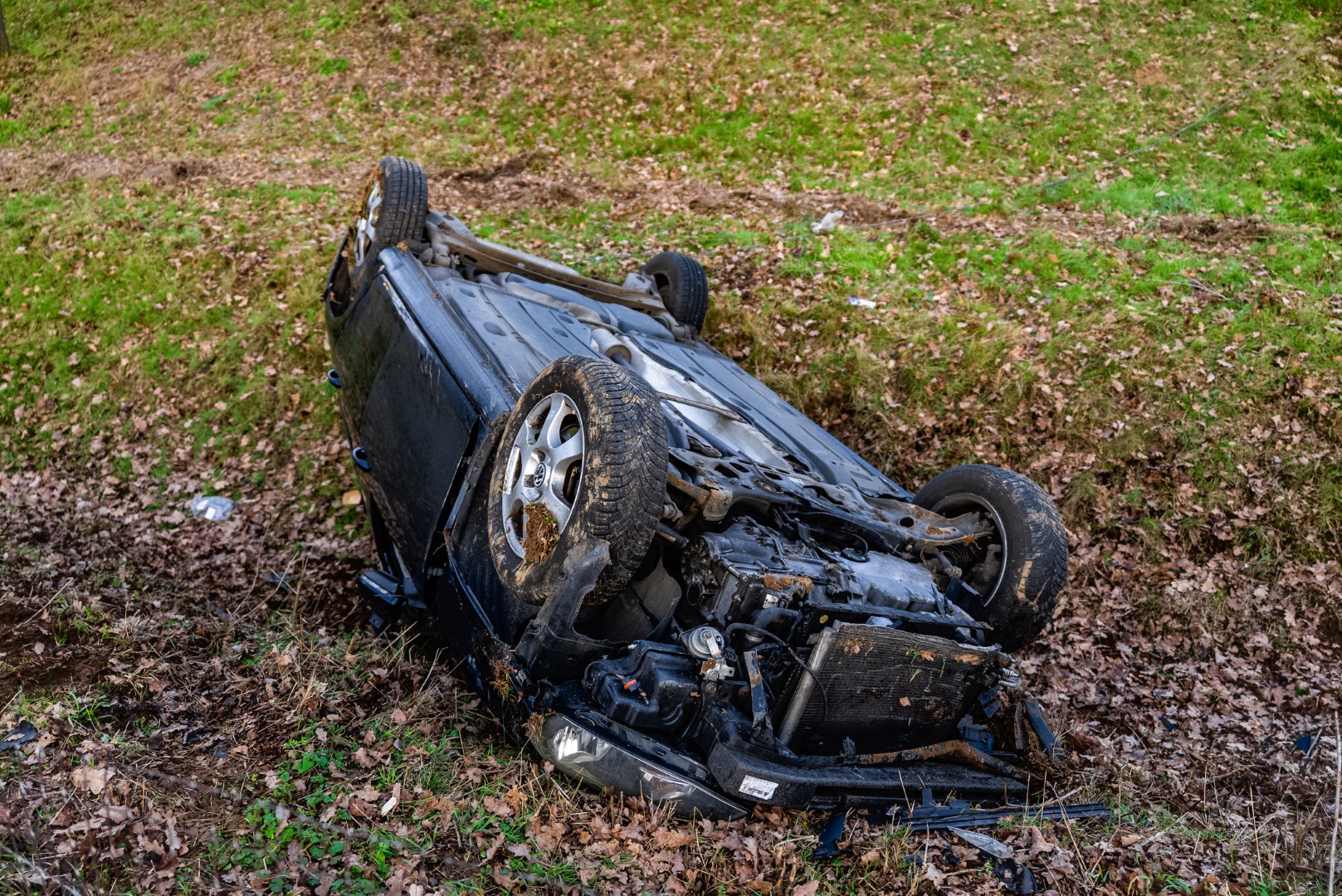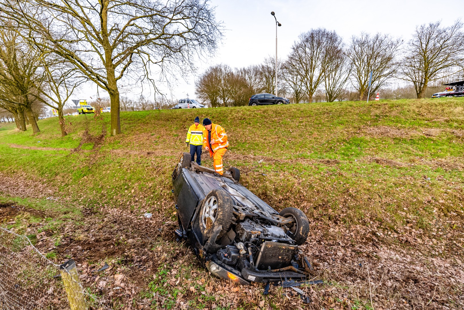 Het ongeval gebeurde op de afrit, waar het voertuig tussen twee bomen doorschoot en vervolgens in een sloot terechtkwam. Daarna kwam de auto ondersteboven tot stilstand. De bestuurder, die alleen in het voertuig zat, werd per ambulance overgebracht naar het ziekenhuis. Over de aard van het letsel werd niets bekendgemaakt.