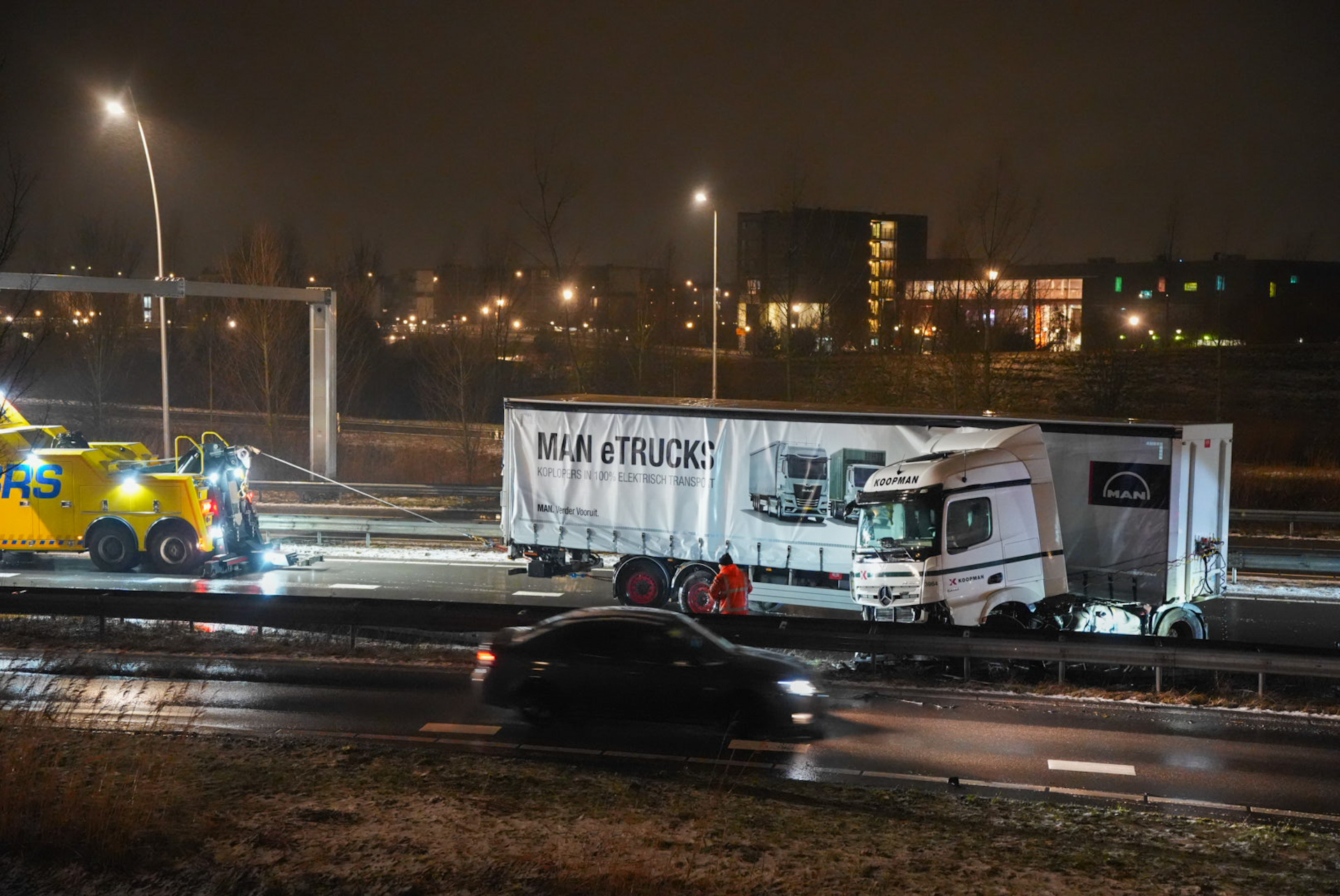 Vrachtwagen schaart op gladde weg en botst tegen vangrail