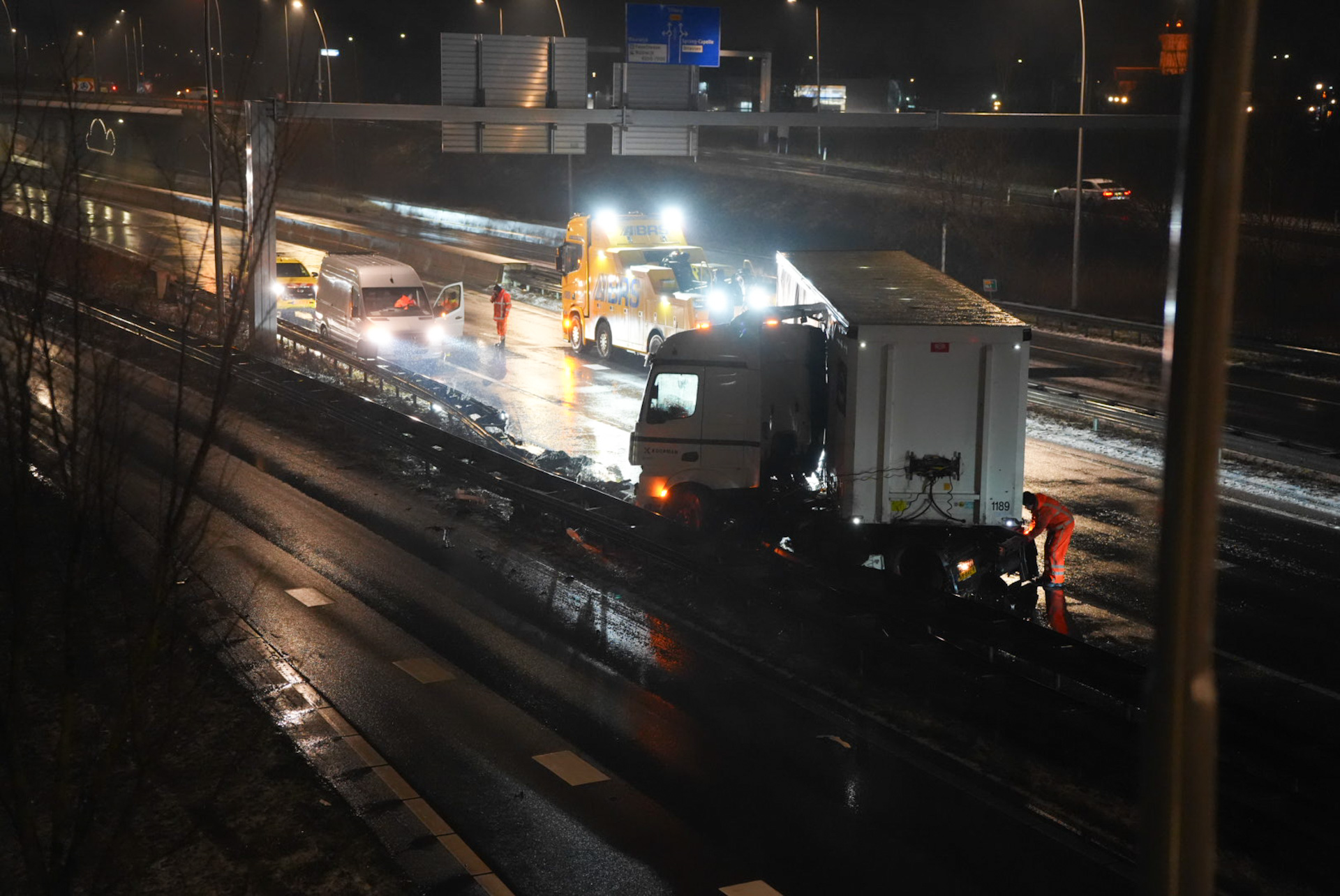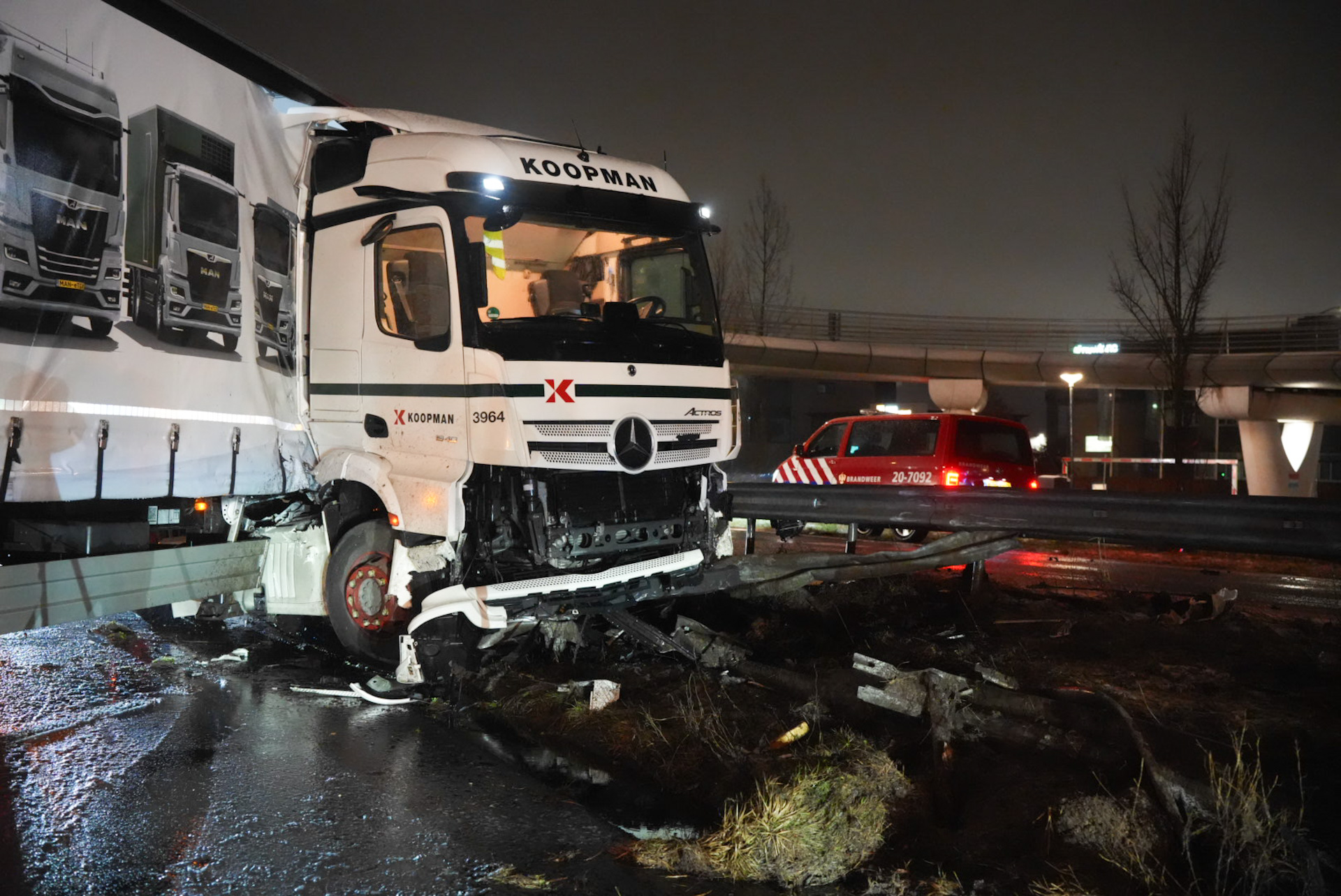 Vrachtwagen schaart op gladde weg en botst tegen vangrail