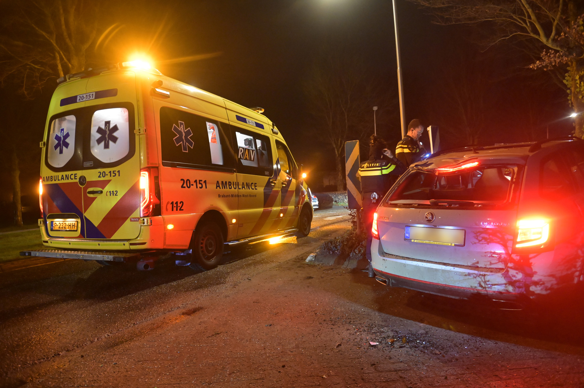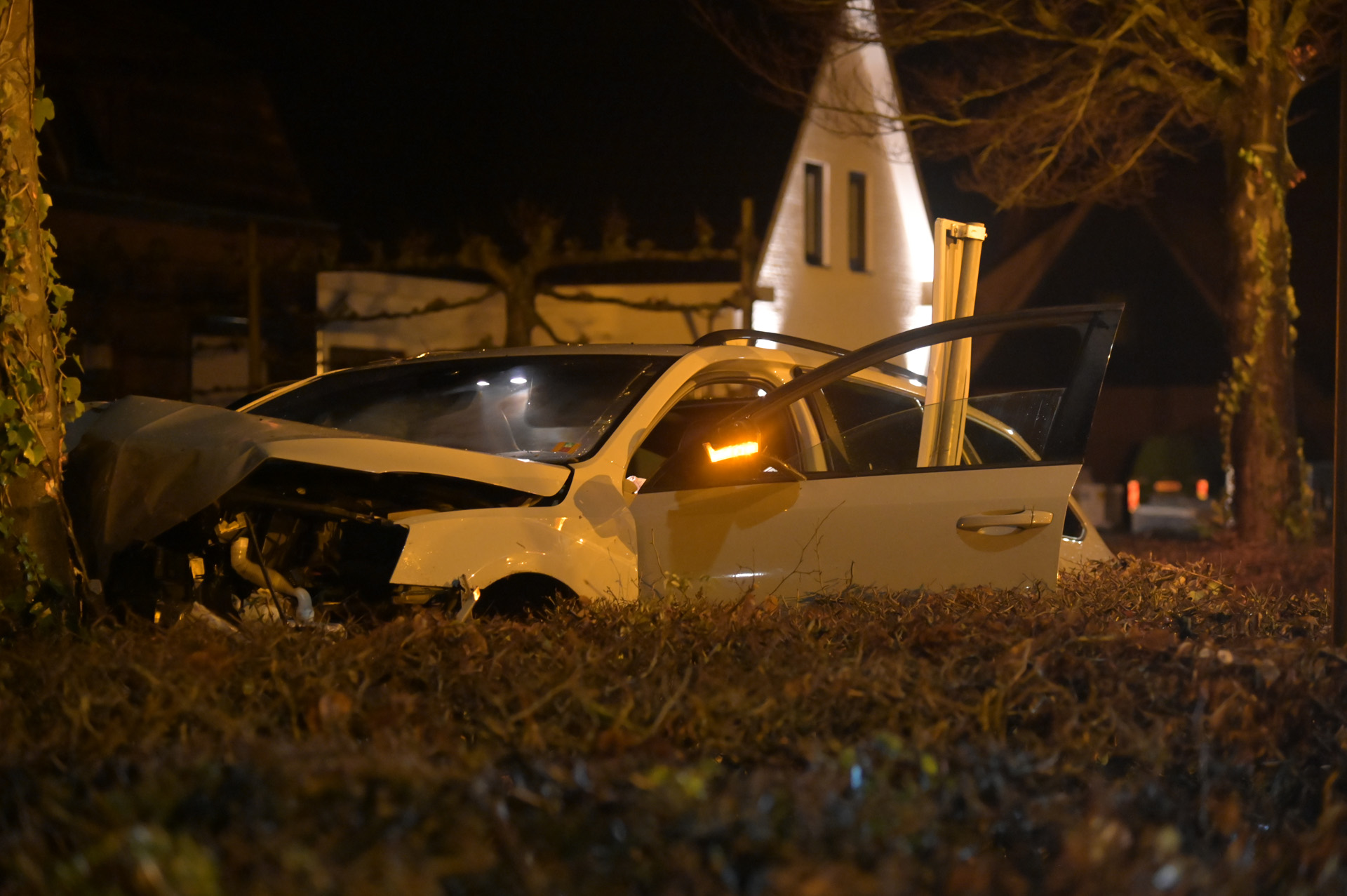 Door een nog onbekende oorzaak raakte een automobilist in een bocht van de weg. Daarbij werd een lantaarnpaal omver gereden, waarna het voertuig in een bossage terechtkwam en tegen een boom tot stilstand kwam. De auto liep aanzienlijke schade op.