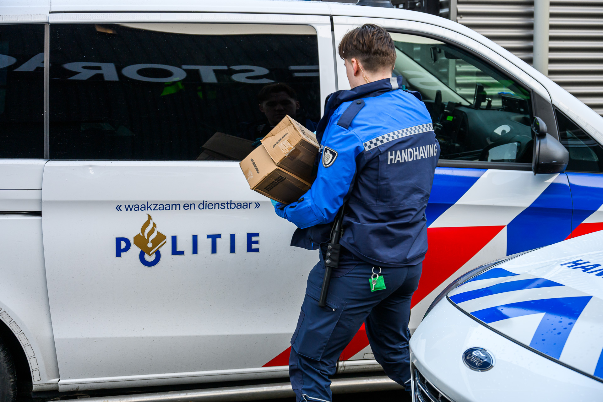Een van de handhavers kwam met twee dozen naar buiten, waarin mogelijk cilinders met lachgas zaten. Een woordvoerder van de politie kon nog niet zeggen wat er precies is gevonden.