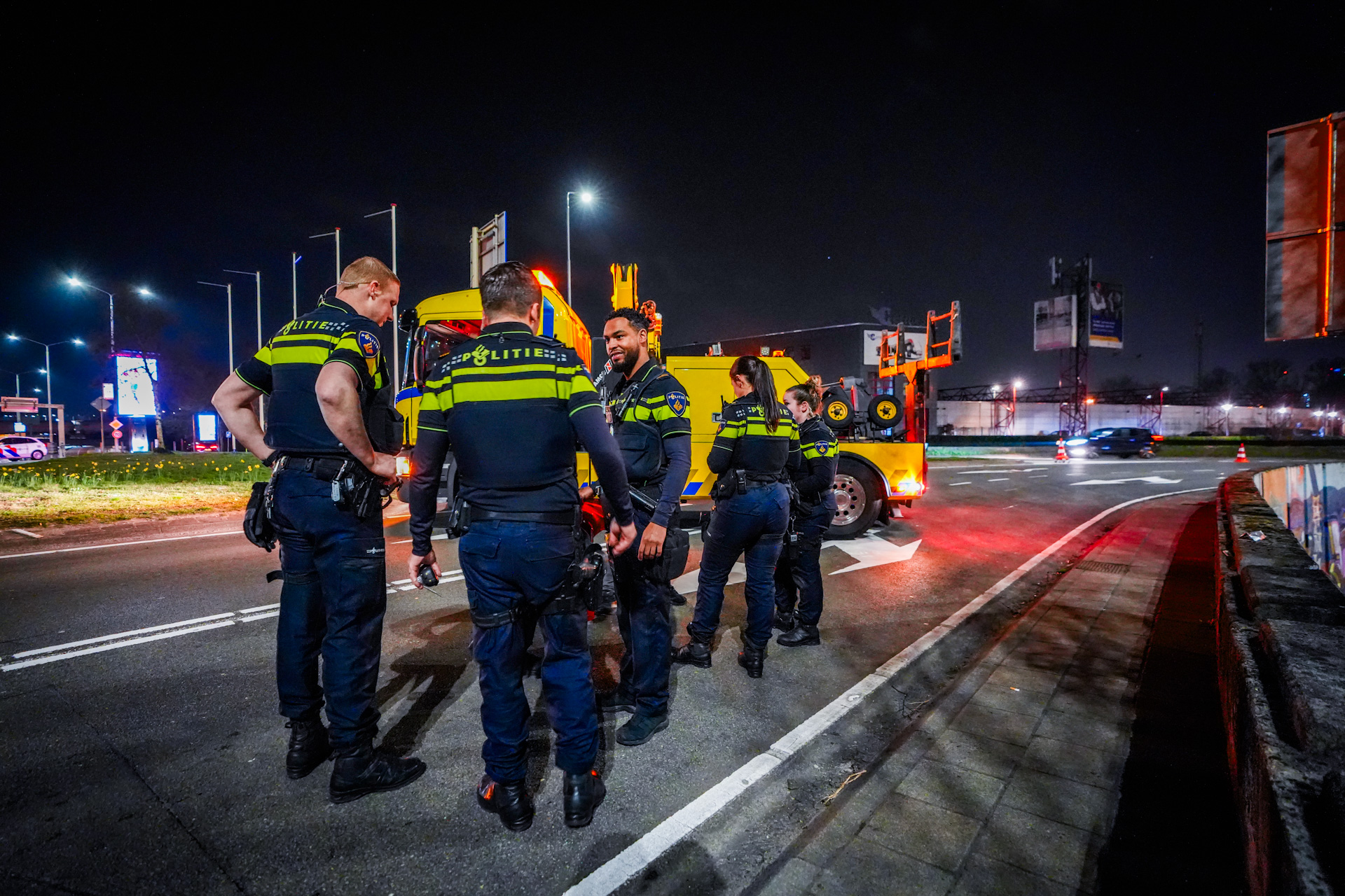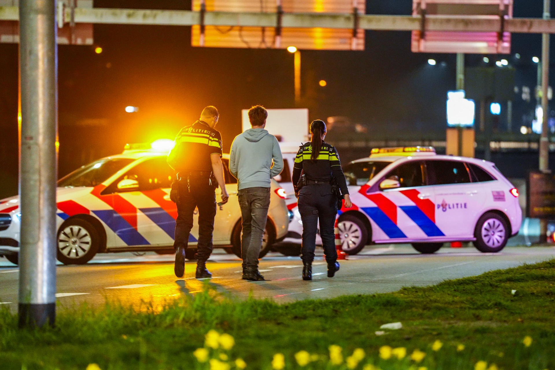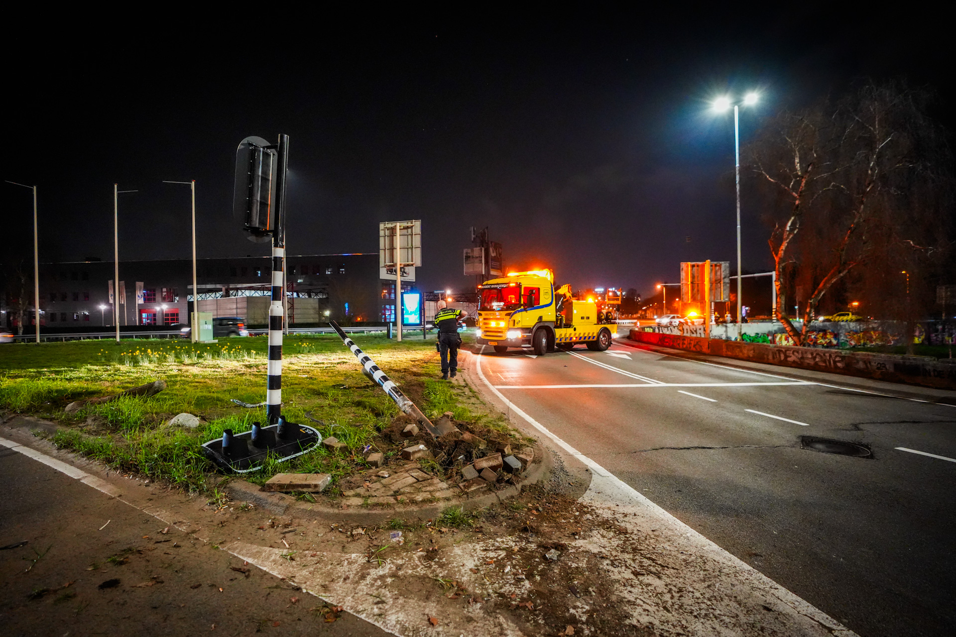 De bestuurder botste tegen een verkeerslicht, waardoor meerdere verkeerslichten op de rotonde uitvielen. Hoe het ongeval precies kon gebeuren en uit welke richting het voertuig kwam, is nog onduidelijk. Na de botsing probeerde de bestuurder weg te rijden, maar dat lukte niet omdat een voorwiel was afgebroken. Daarna ging hij te voet verder.