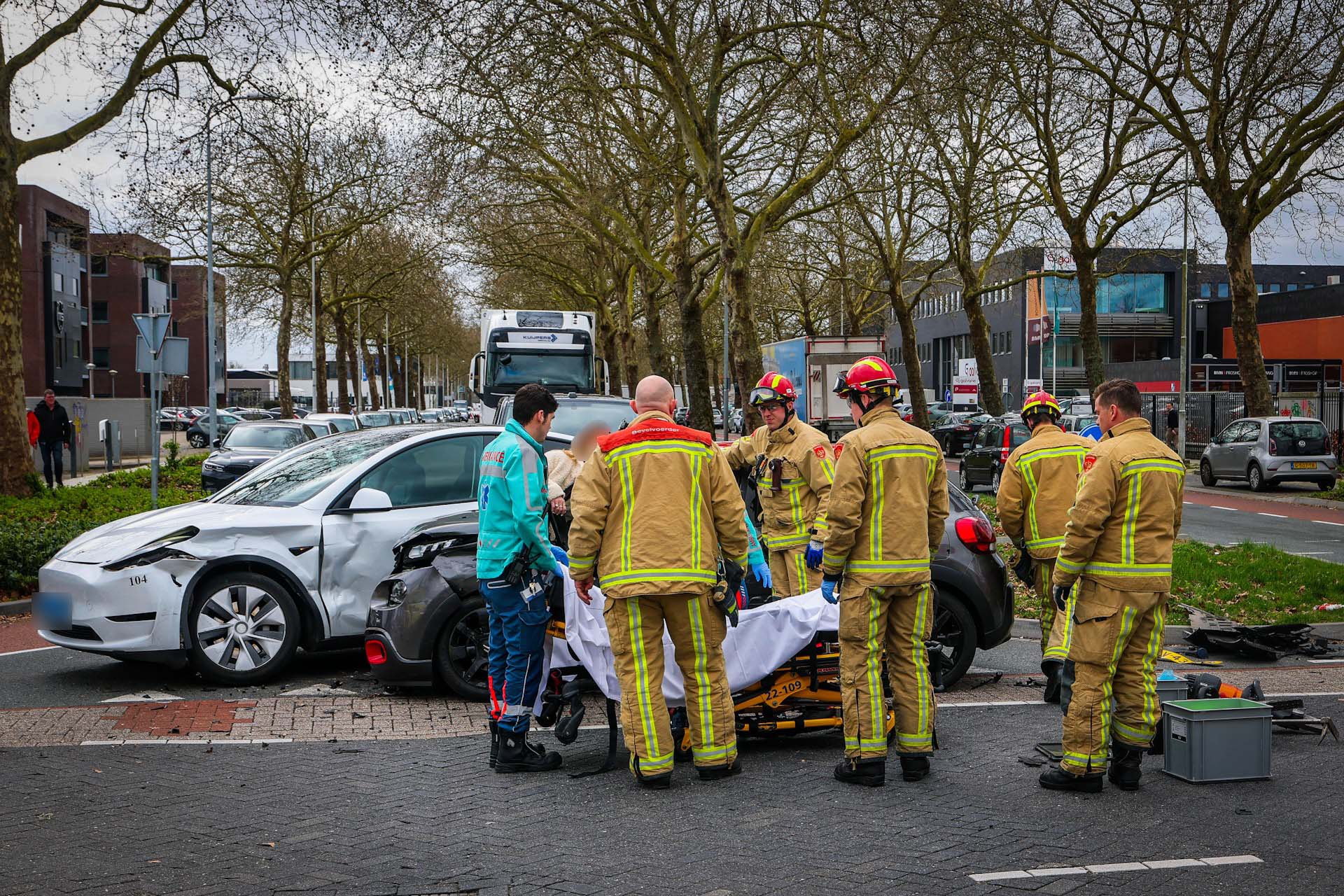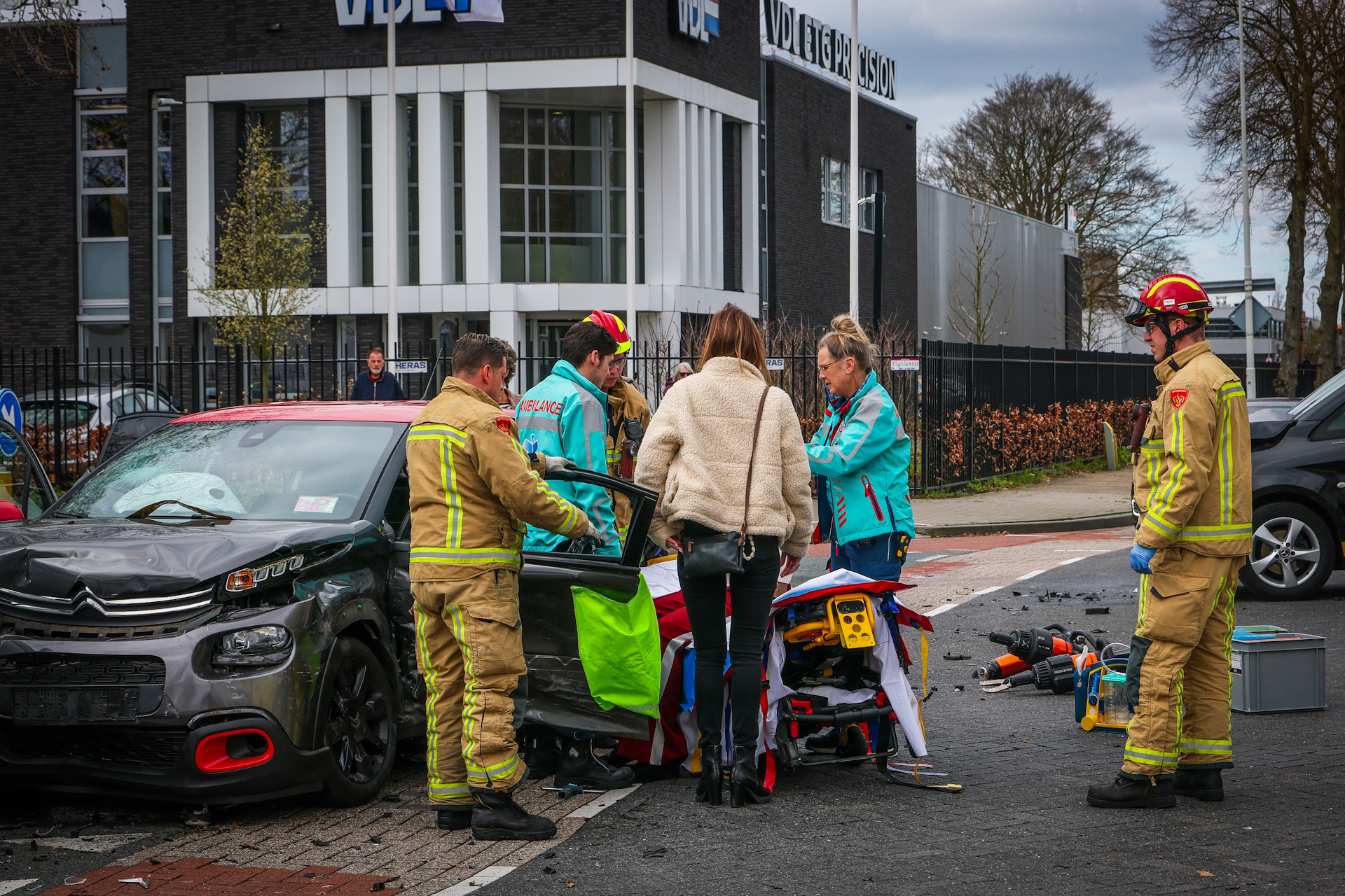Rond het begin van de middag kwamen de voertuigen met elkaar in botsing. Een vrouw raakte bekneld in haar auto en is door hulpdiensten en de brandweer uit het voertuig gehaald. Zij is gewond overgebracht naar het ziekenhuis. Ook een bestelbus en een taxi liepen aanzienlijke schade op door de aanrijding.