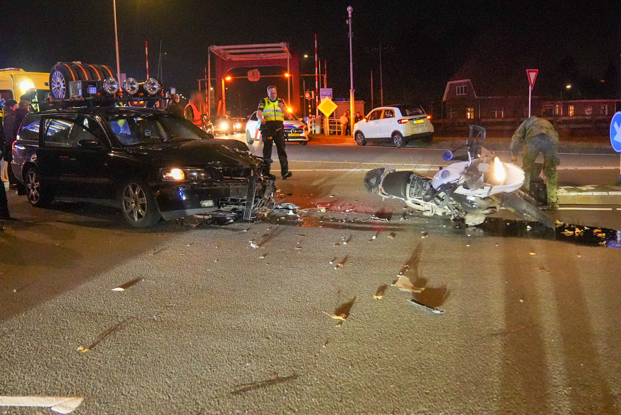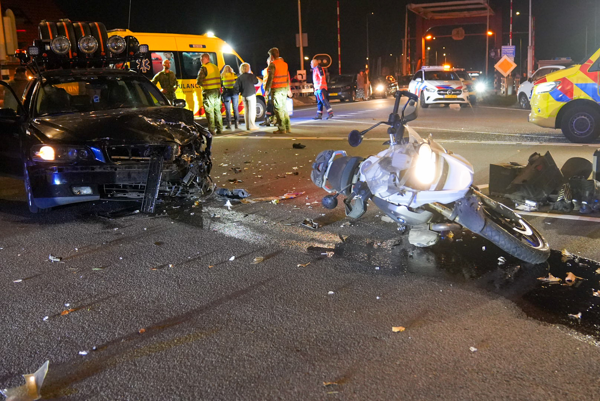 Motor en auto botsen bij verkeerslichten, weg volledig afgesloten