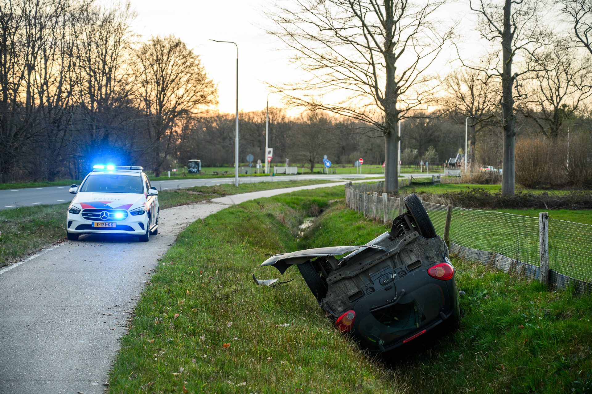 De bestuurder verloor vermoedelijk in een flauwe bocht de macht over het stuur. Het voertuig kwam ondersteboven tot stilstand in het water. De man wist zelfstandig uit de auto te komen en werd nagekeken door ambulancepersoneel. Hij hoefde niet naar het ziekenhuis.