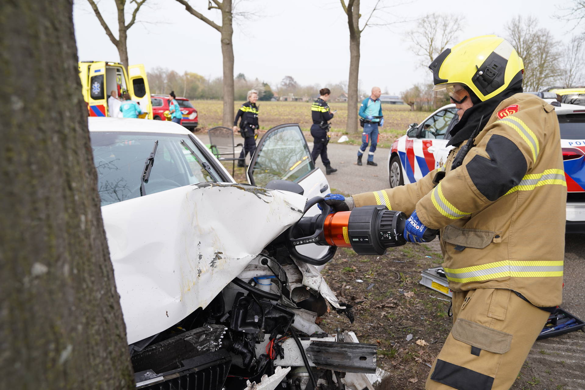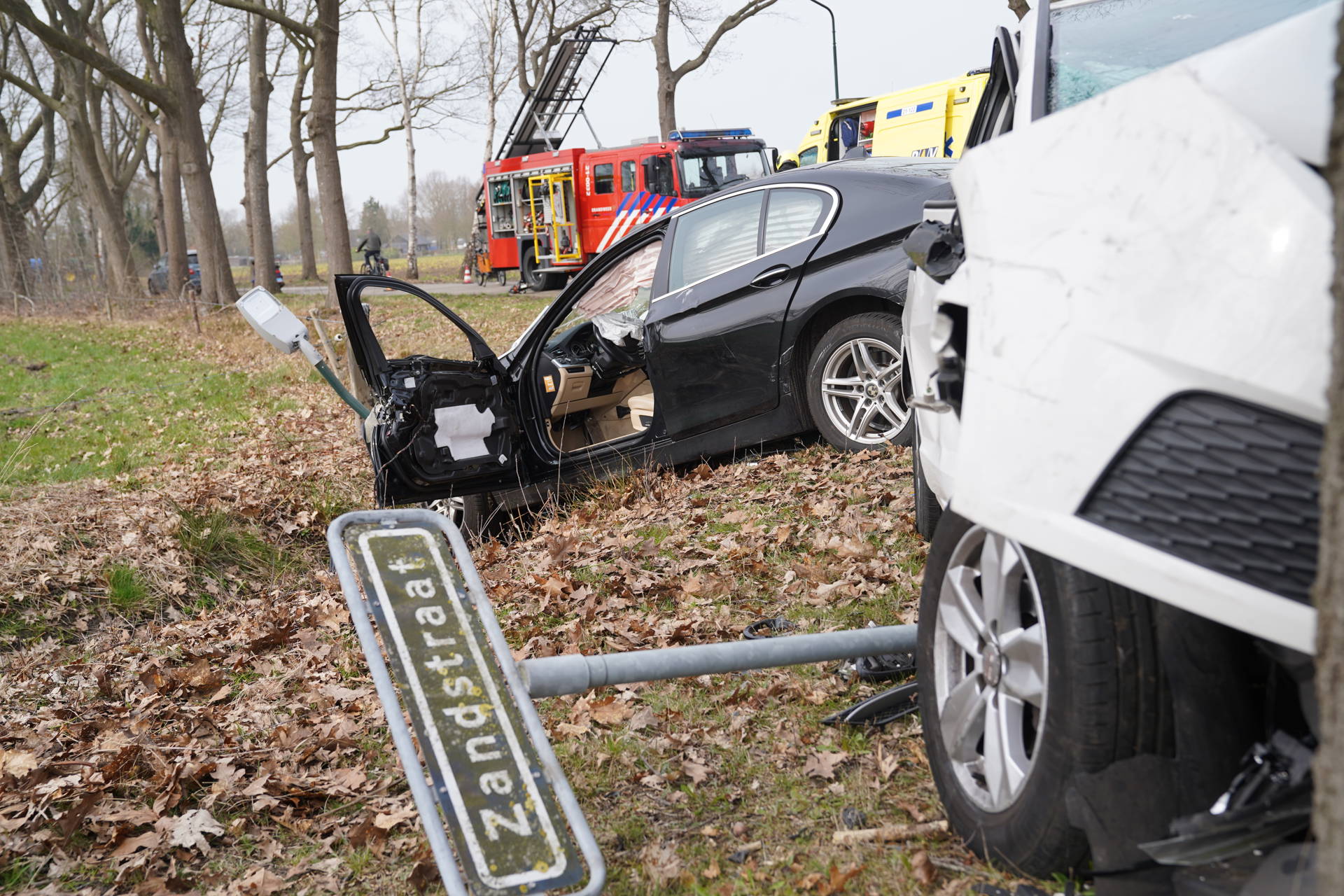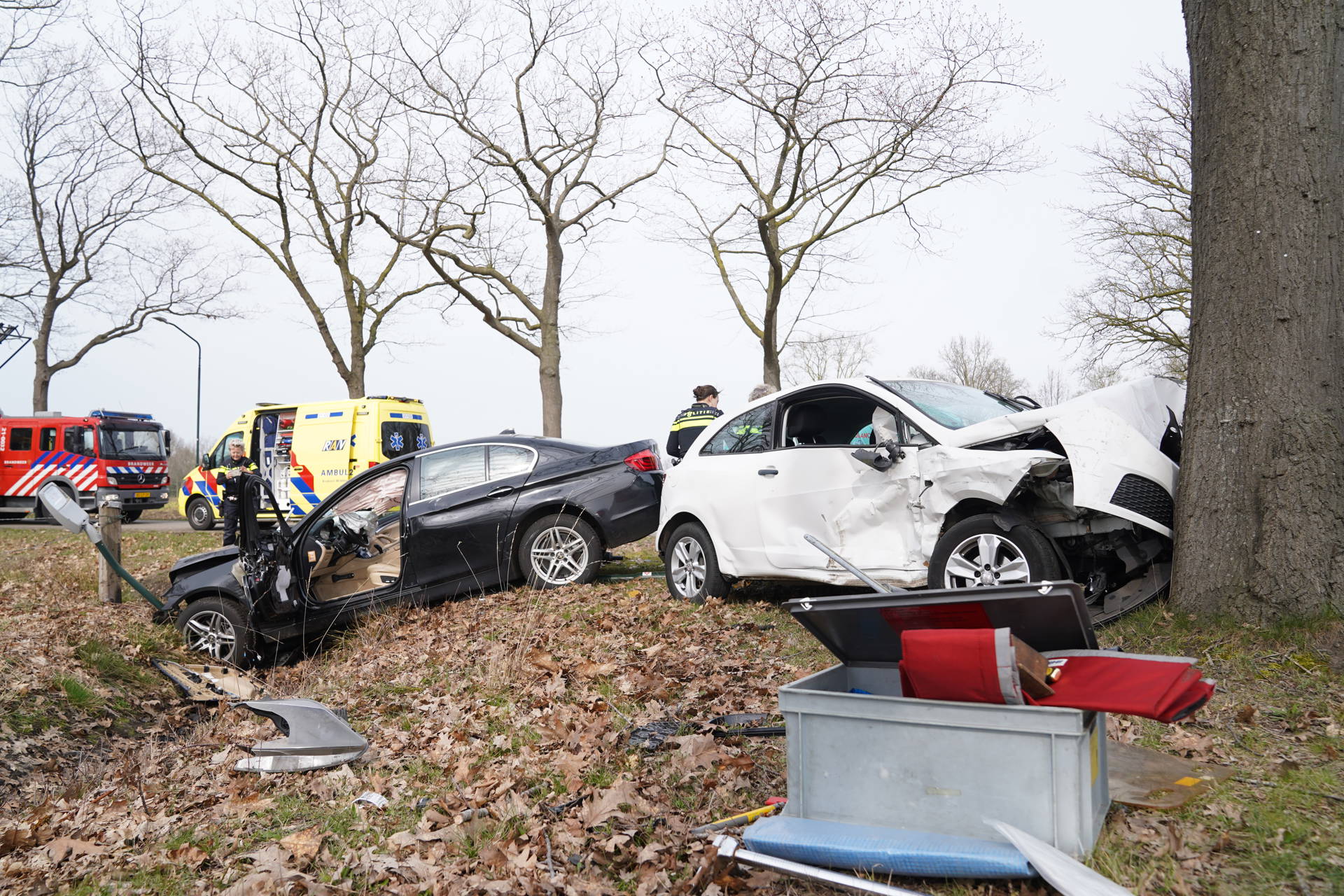 De aanrijding ontstond kort na 13.10 uur. Bij het ongeval belandde één auto in een greppel, terwijl het andere voertuig tot stilstand kwam tegen een boom. Daarbij is één persoon gewond geraakt.