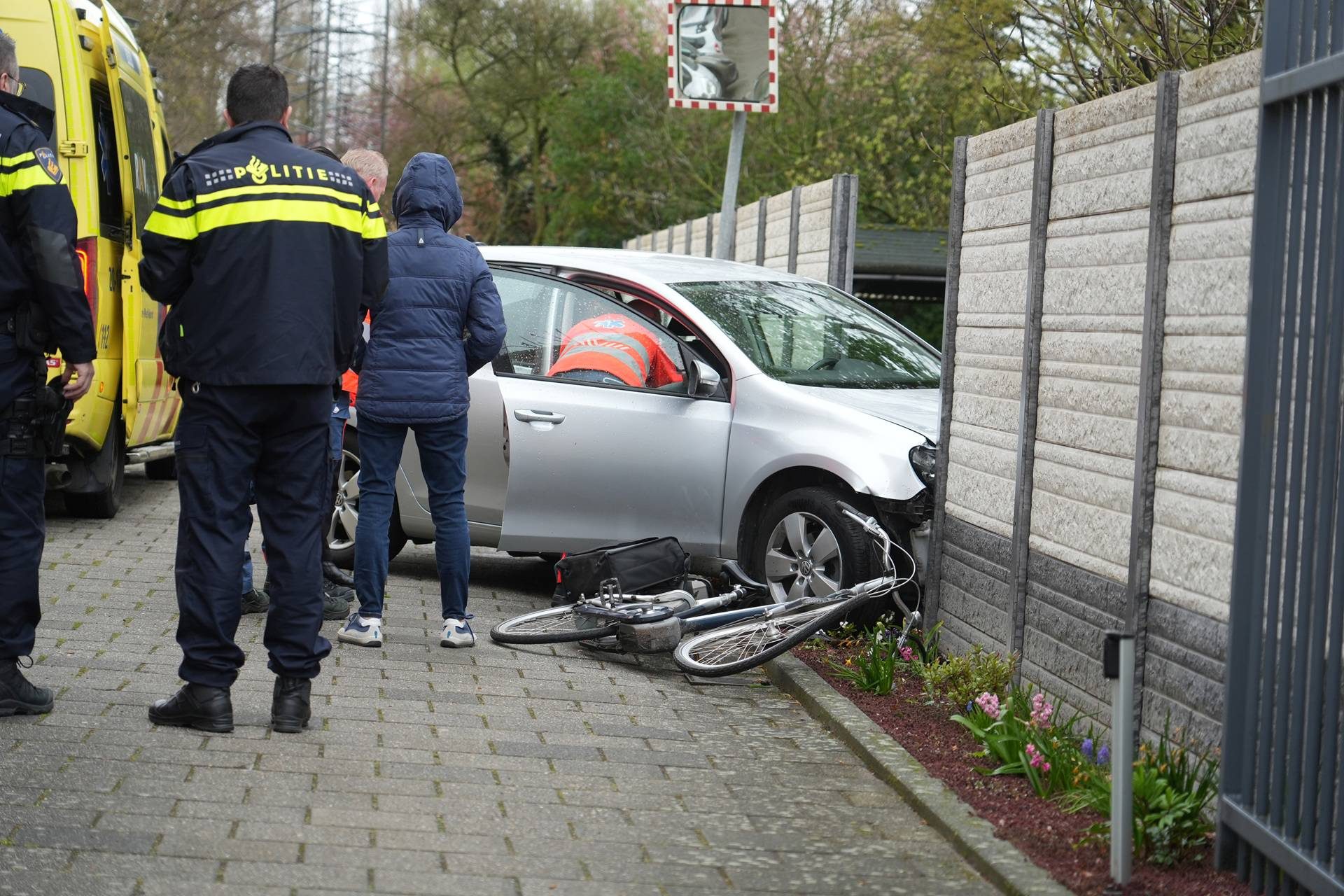 Na de aanrijding reed de automobilist door een betonnen schutting. Volgens een omstander bleef de bestuurder ongedeerd.