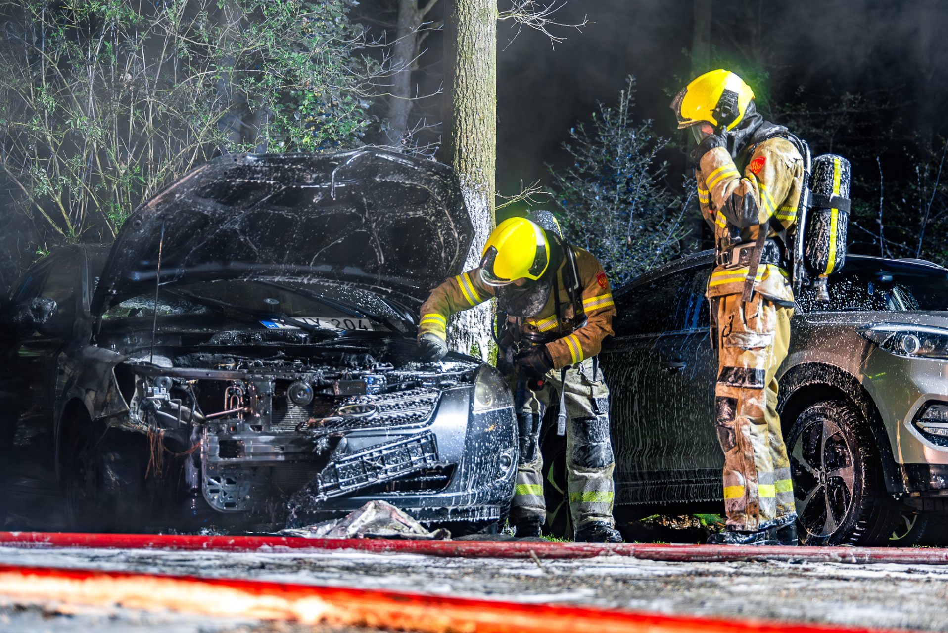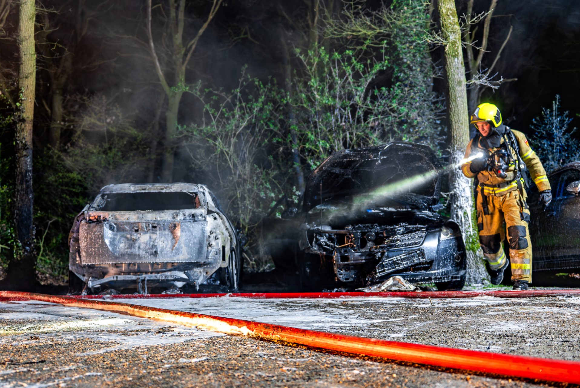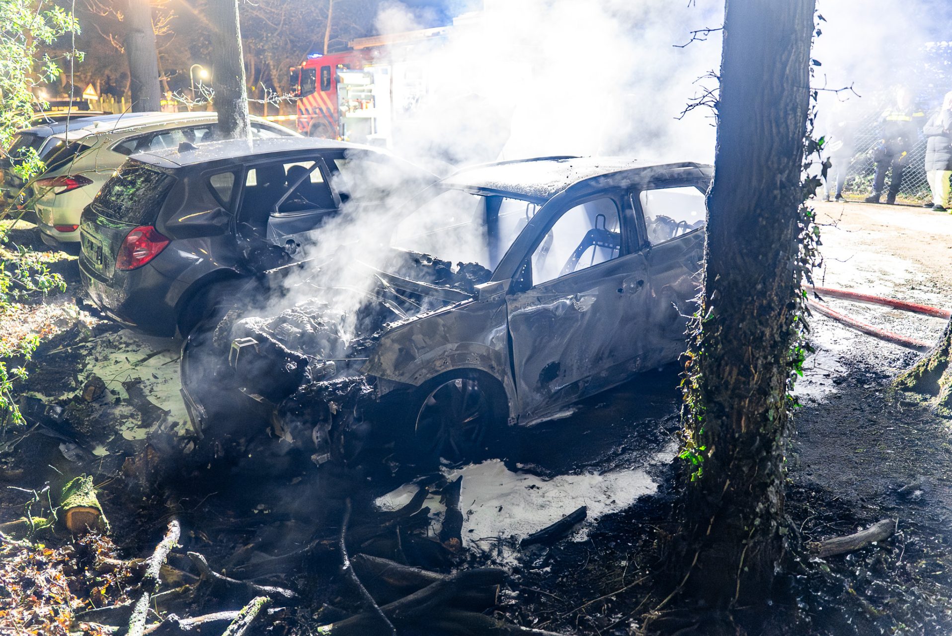 De brand breidde zich snel uit, waarbij één auto volledig uitbrandde en een tweede voertuig zwaar beschadigd raakte. Daarnaast liepen twee andere auto’s die in de buurt stonden eveneens schade op door de hitte van het vuur.