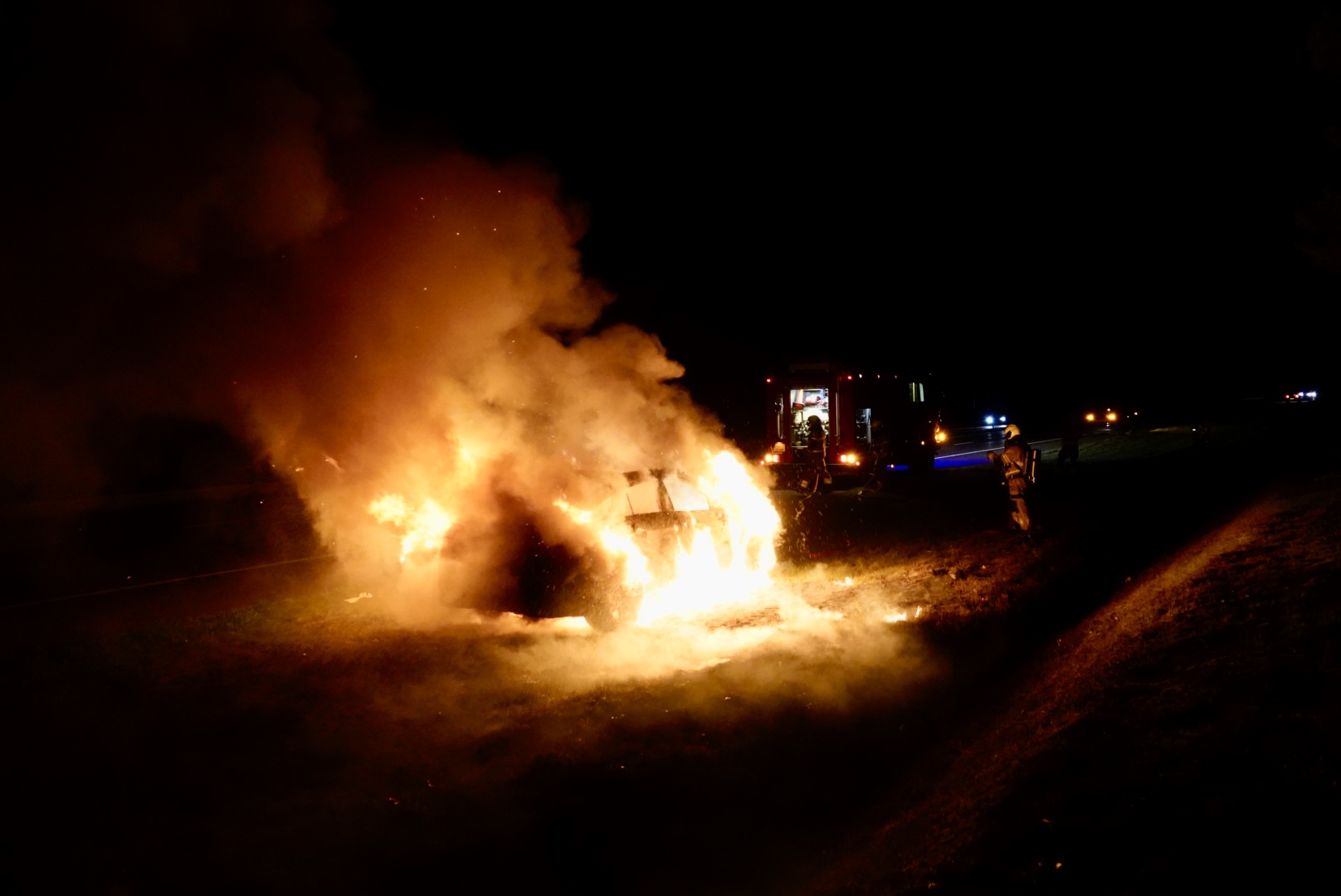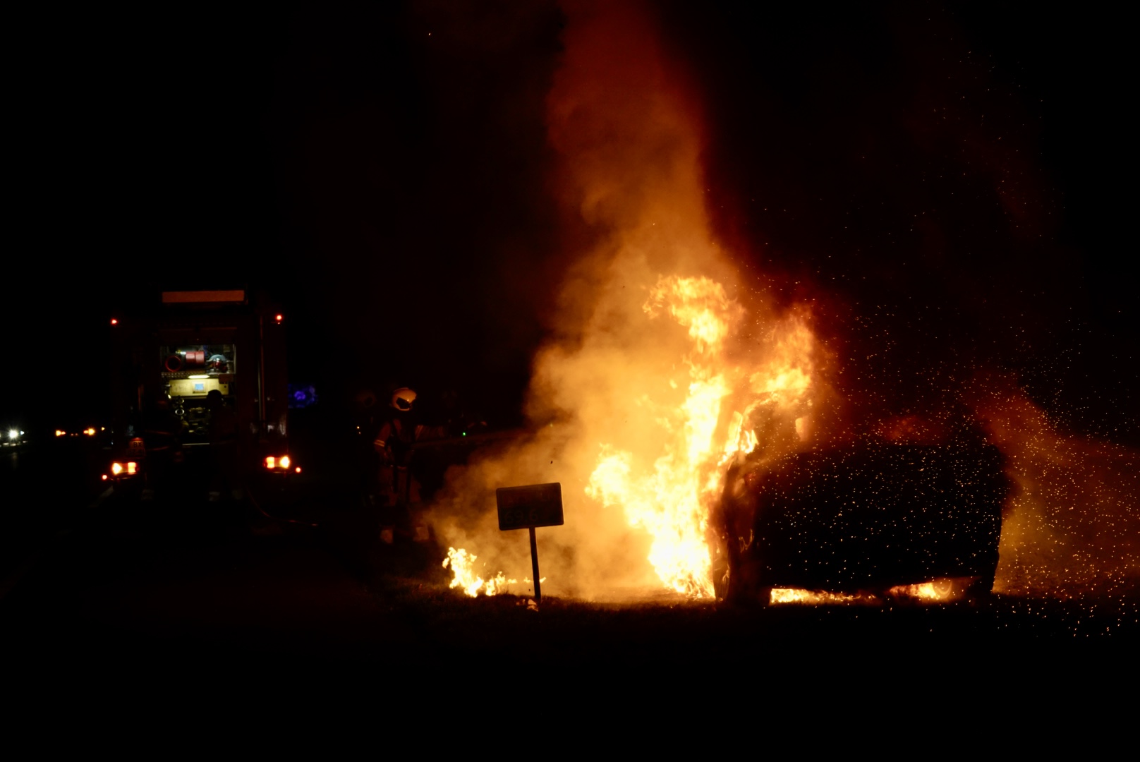 Het voertuig stond volledig in de berm. Na het blussen is de uitgebrande auto door een bergingsbedrijf afgesleept.
