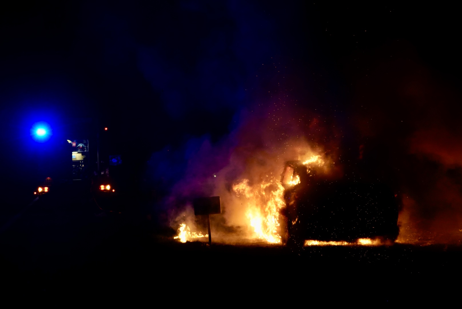 Het voertuig stond volledig in de berm. Na het blussen is de uitgebrande auto door een bergingsbedrijf afgesleept.