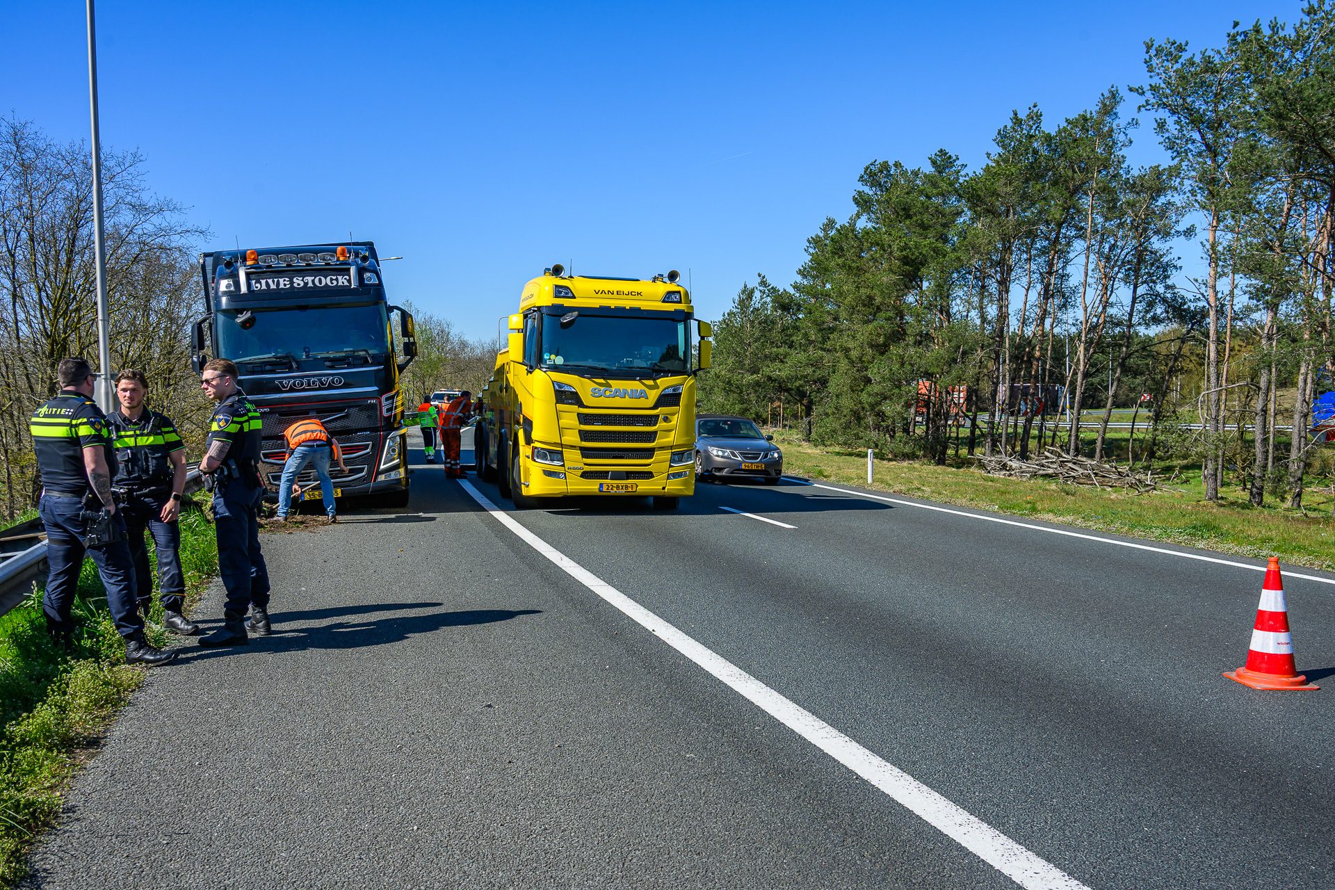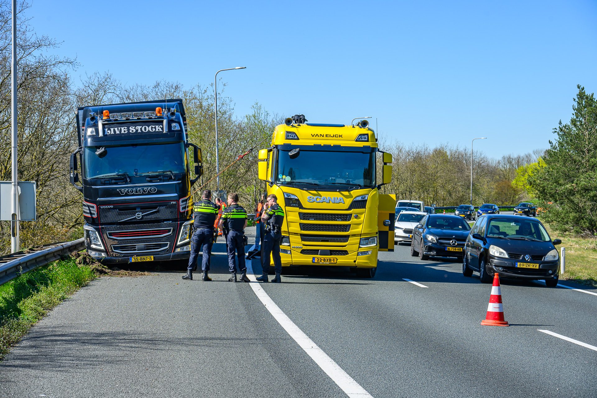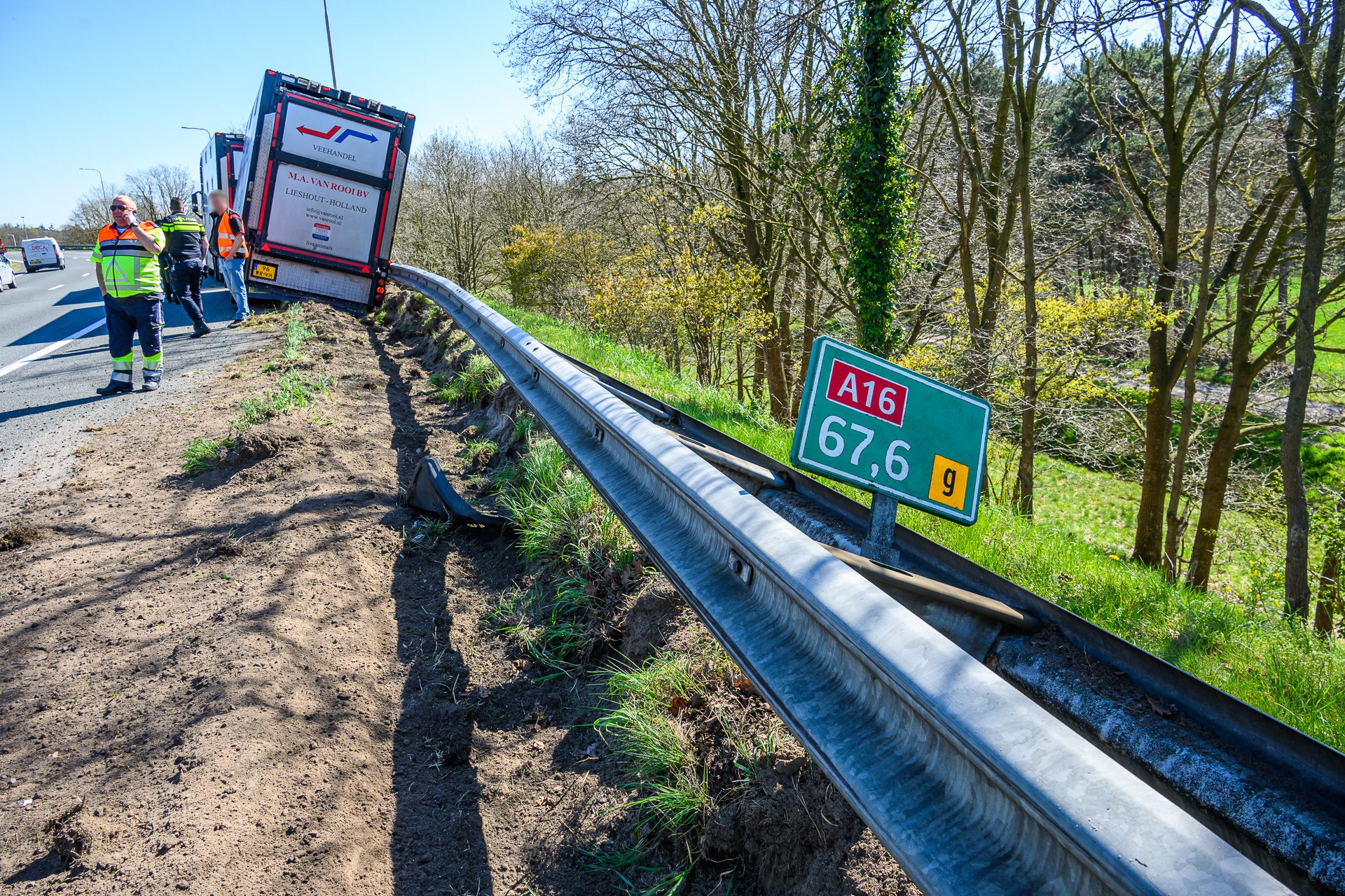 Door het incident is de rechterrijstrook afgesloten. De vrachtwagen staat schuin in de vangrail en kan daardoor niet verder rijden. Ook de vangrail raakte beschadigd.